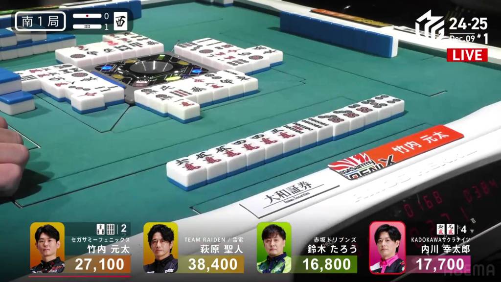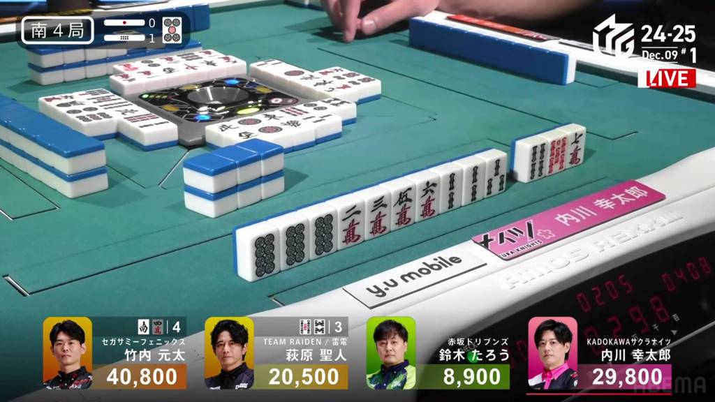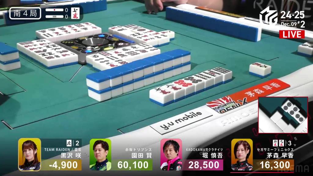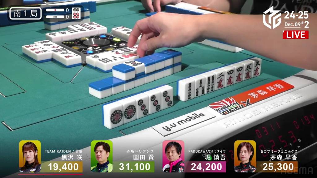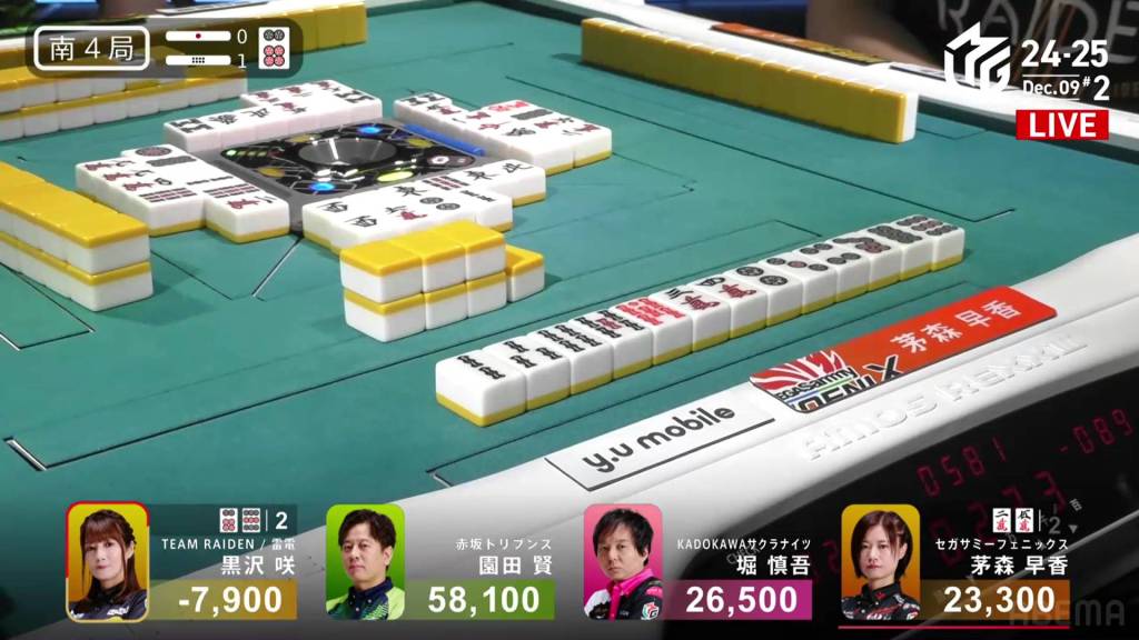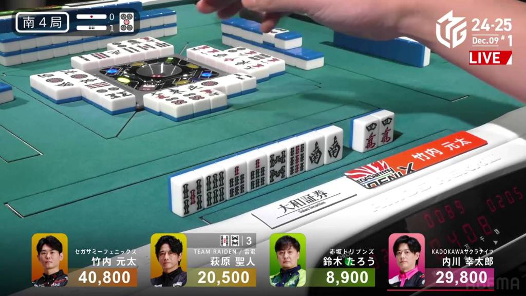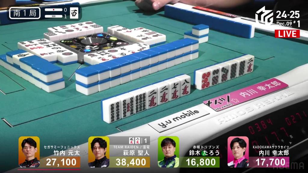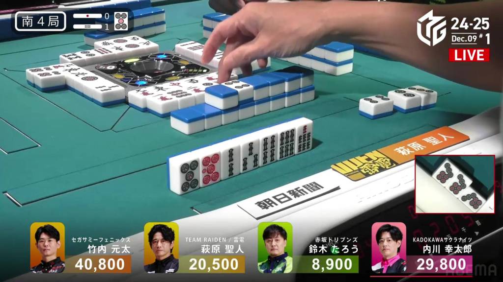 In S4-1, Kayamori is now just 3,200 behind 2nd place Hori. Anything more than 2 han is enough to move up.