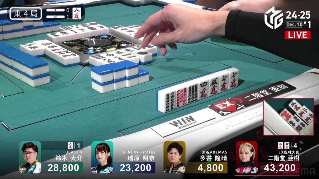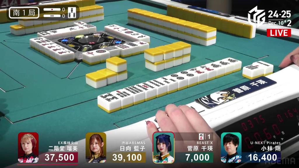 At the end of the second row, Mizuhara is the third to tenpai and calls riichi on a 47m ryanmen. Unfortunately, none are left in the wall for her.
