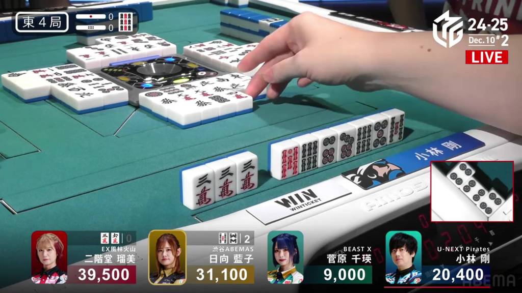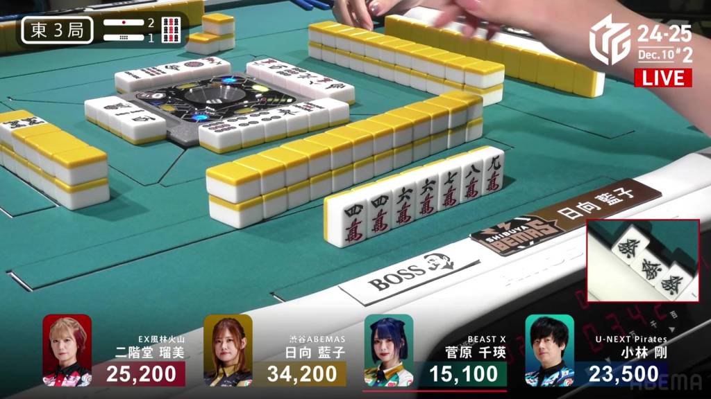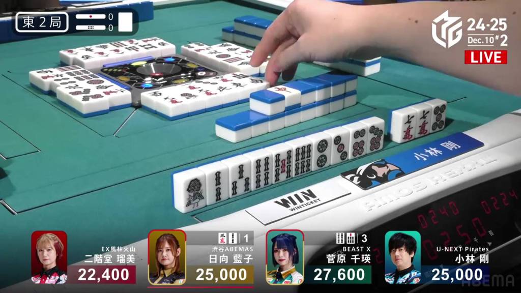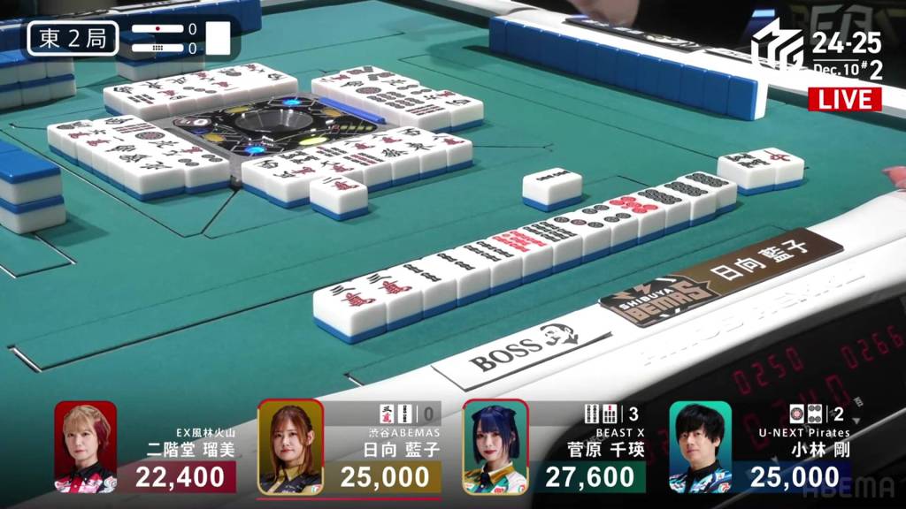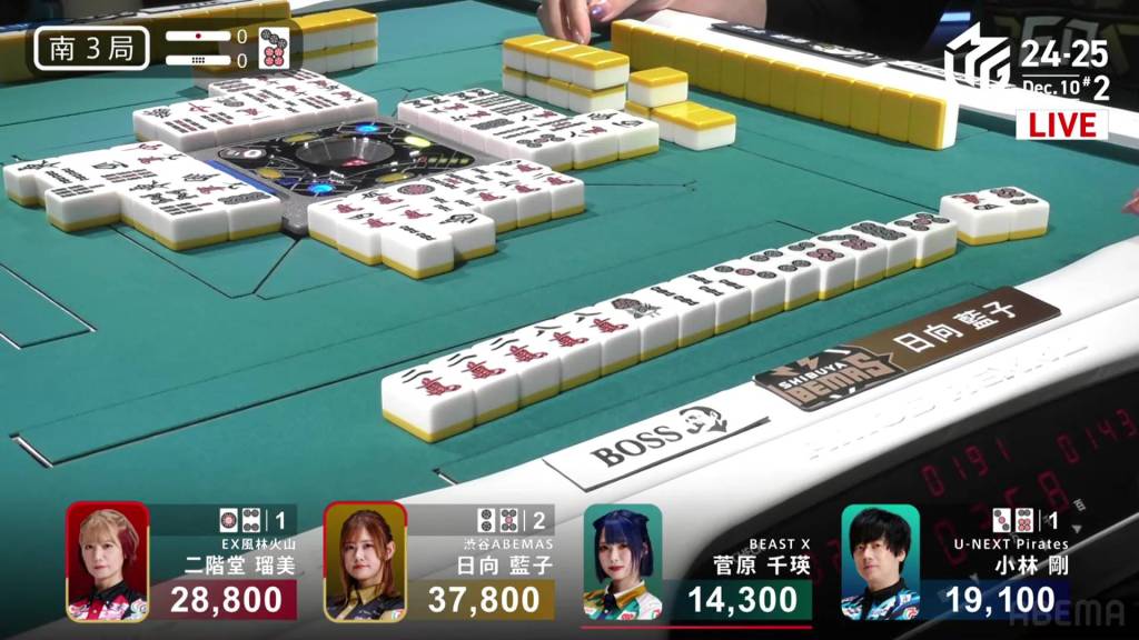 At the start of the third row, Sugawara draws and discards the final 2s in the wall and deals into Hinata. Hinata wins the hand with Riichi/Tanyao/Aka 2 for 12,000 plus Sugawara’s riichi stick.