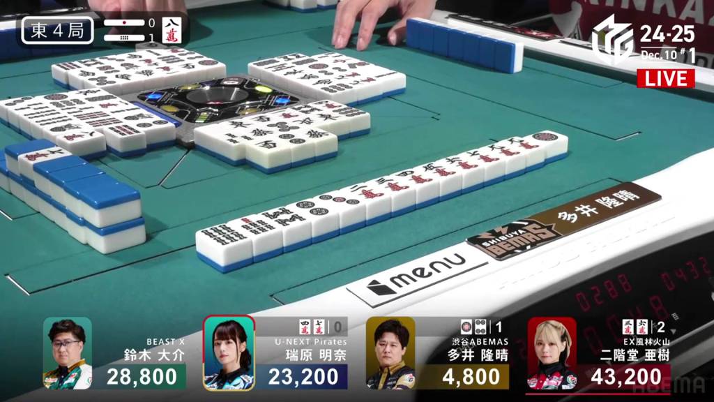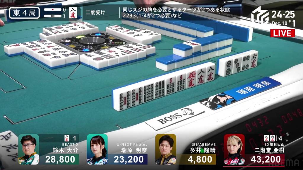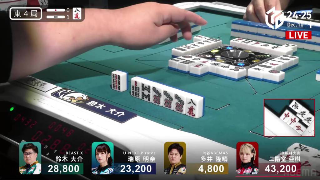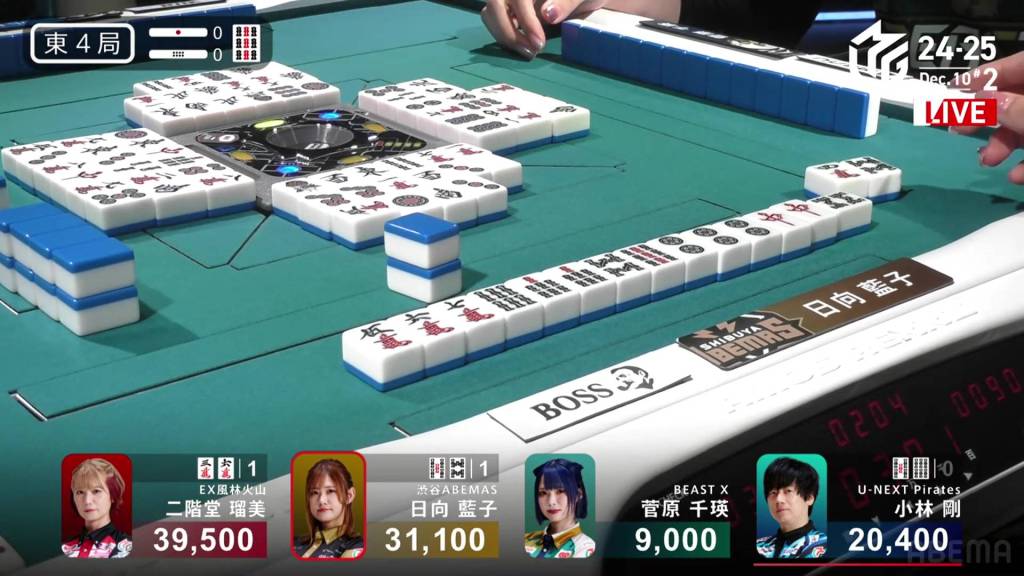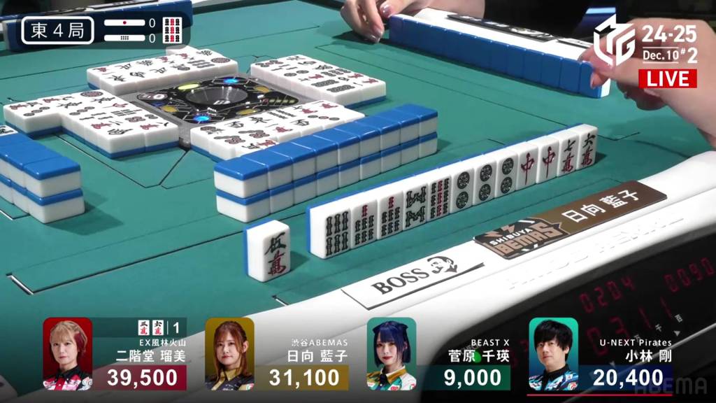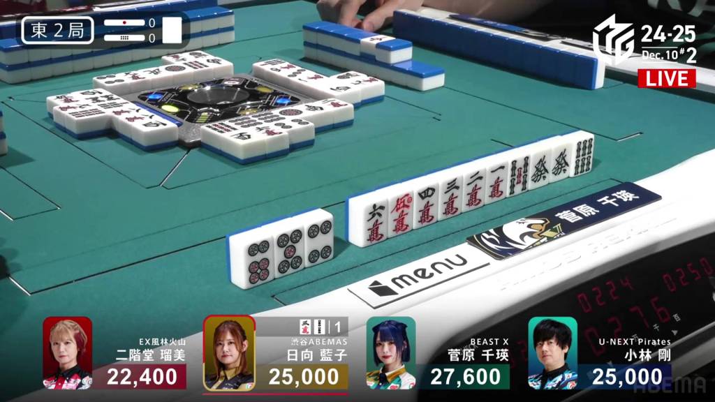 At the start of the third row, Sugawara draws and discards the final 2s in the wall and deals into Hinata. Hinata wins the hand with Riichi/Tanyao/Aka 2 for 12,000 plus Sugawara’s riichi stick.