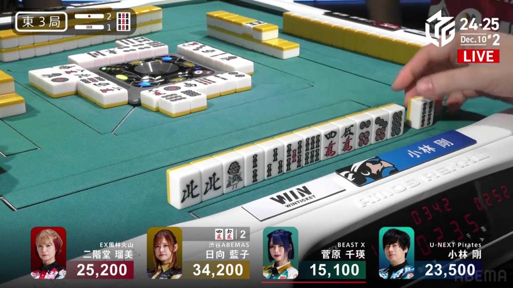 In the middle of the third row, Kobayashi draws the 3m and wins the hand. Kobayashi wins with Riichi/Tsumo/Tanyao for 2,000 all. With Sugawara’s riichi stick Kobayashi moves into 2nd place by just 300.