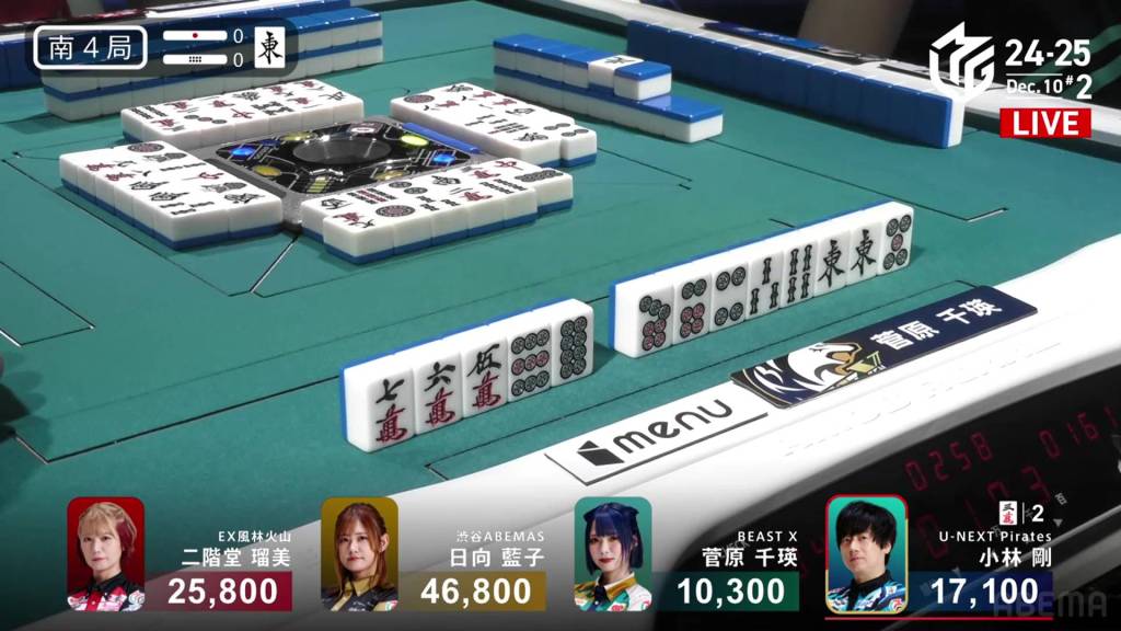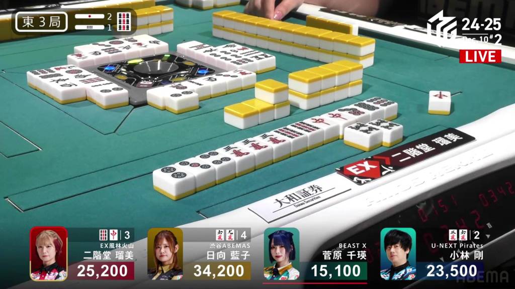 To his left, 4th place Sugawara wants to escape her 4th place demise. Sitting 6,800 behind Kobayashi in riichi, Sugawara can win almost any hand with her east pair and finish in 3rd place. At the end of the row, she gets to tenpai with pinfu and calls riichi on a 25s ryanmen. Unfortunately, no winning tiles remain in the wall for her.