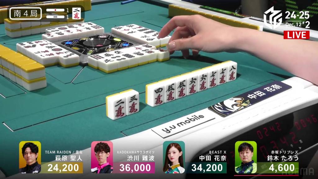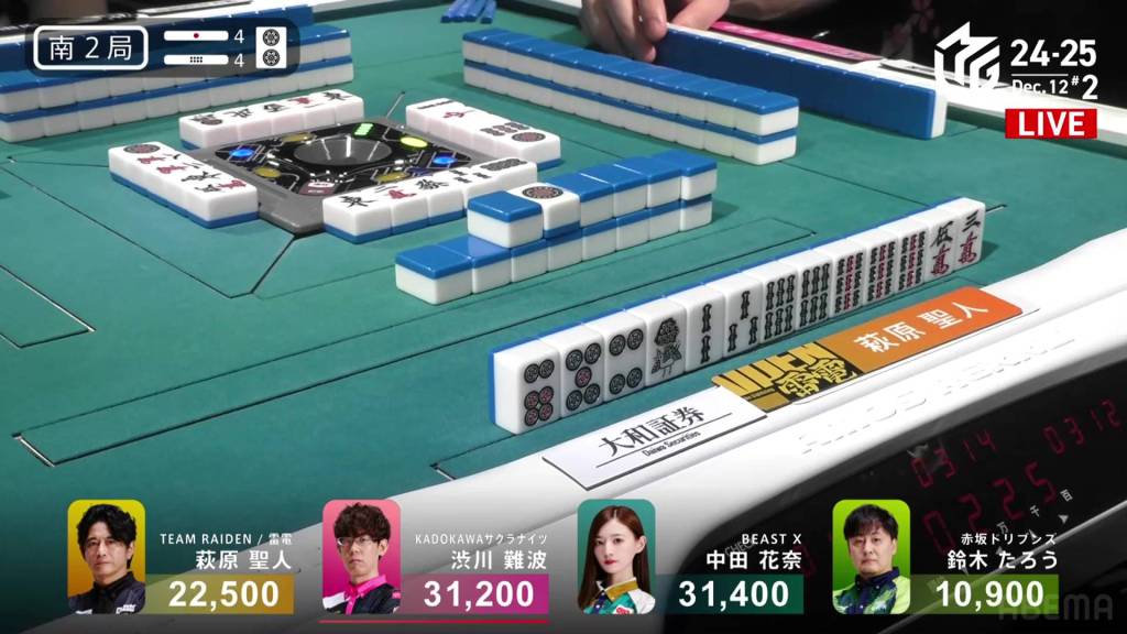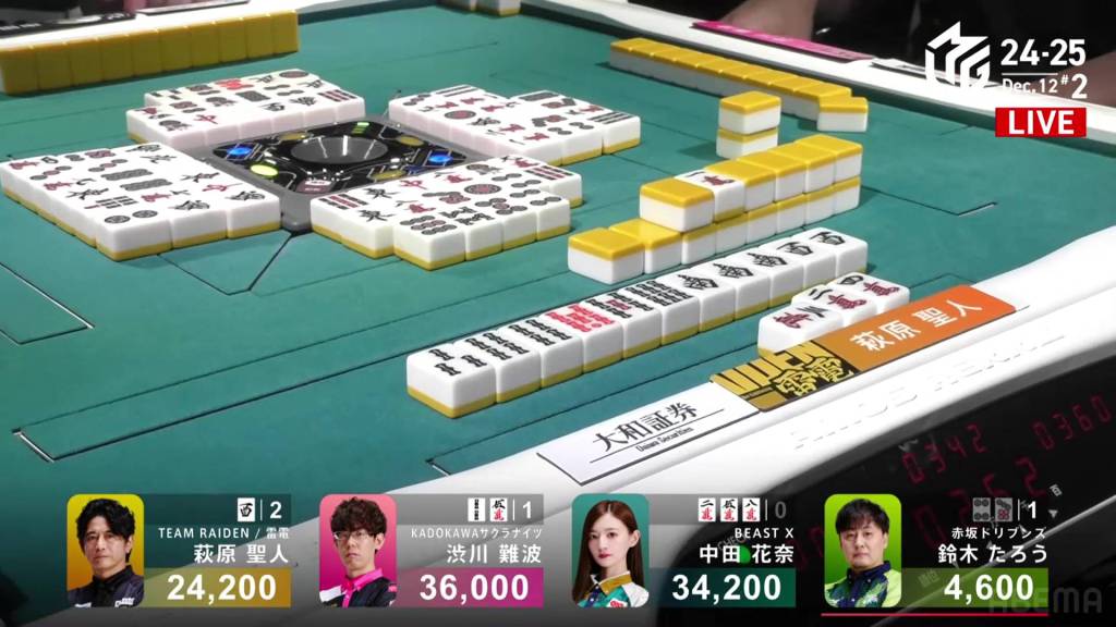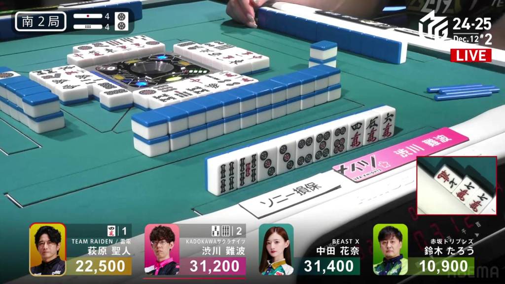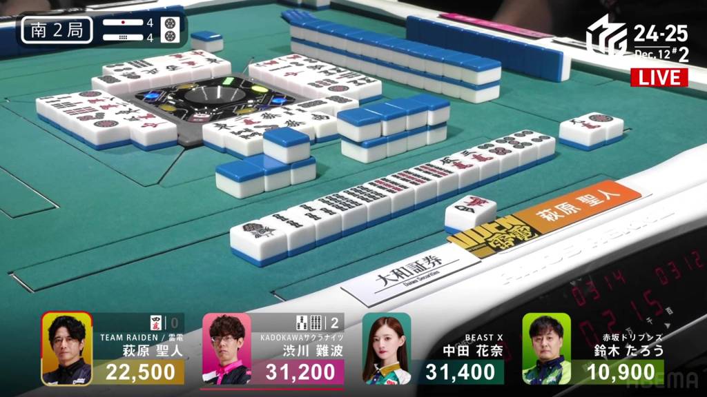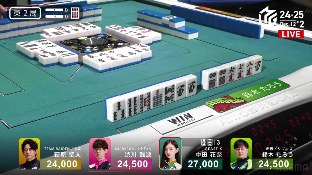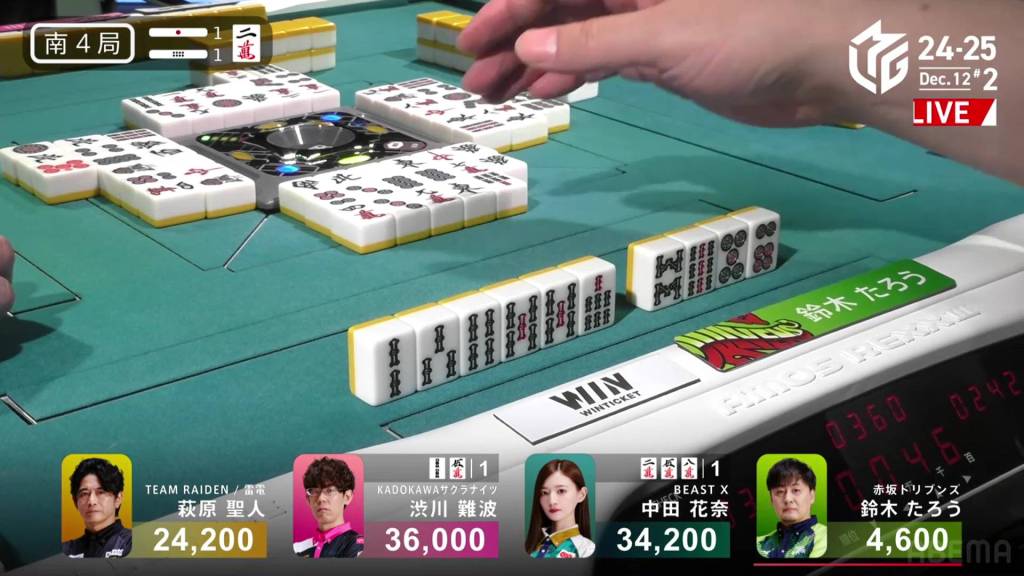 On Hagiwara’s very next draw, he incredibly gets the west and wins the hand! With a Double South/Dora 1/Aka 1 win for 2,000+100/4,000+100 plus a riichi stick, Hagiwara finishes the game in 2nd place and moves Team Raiden back into positive position.