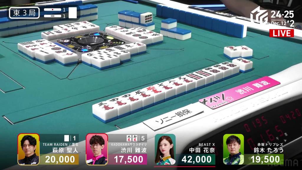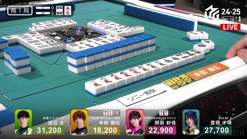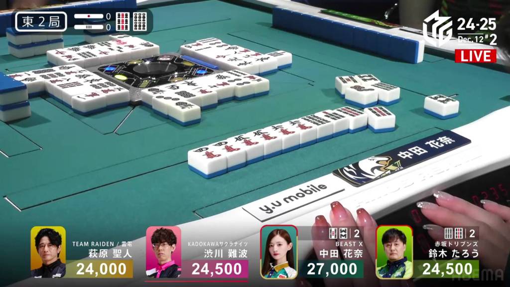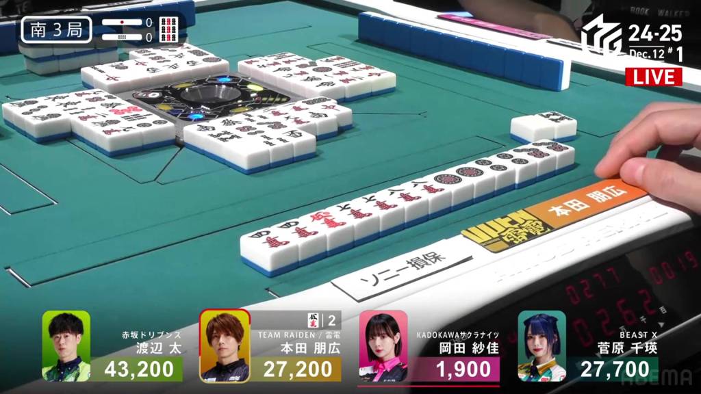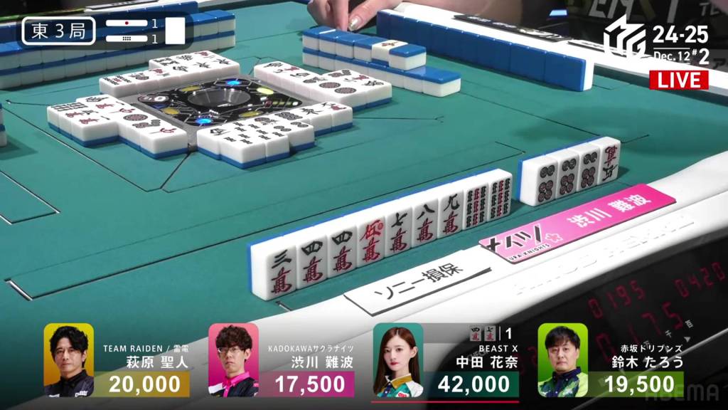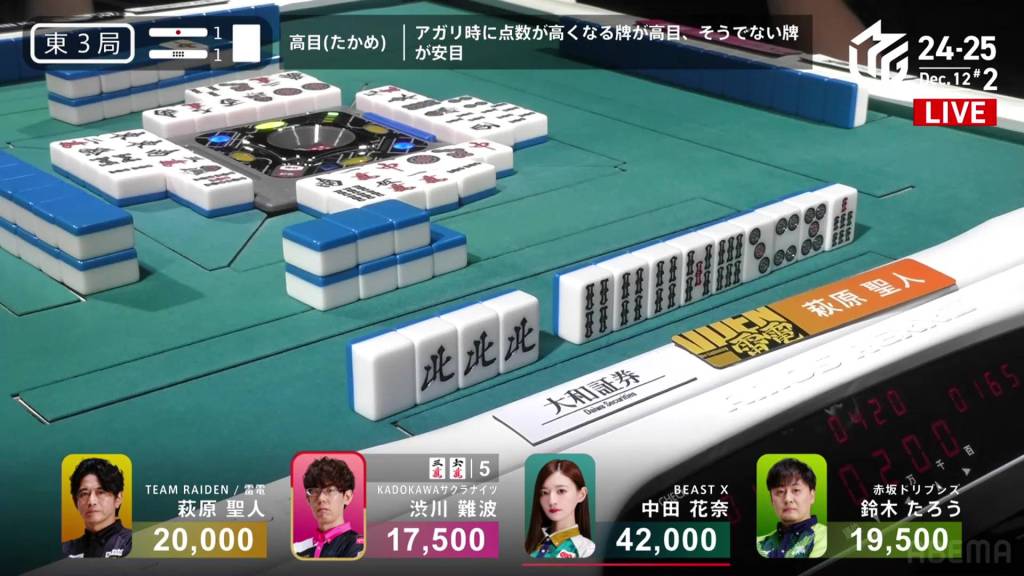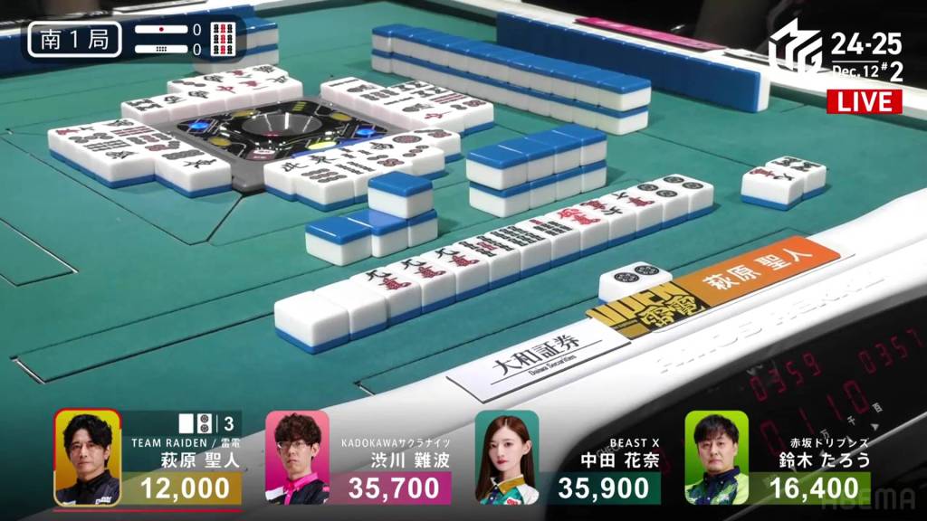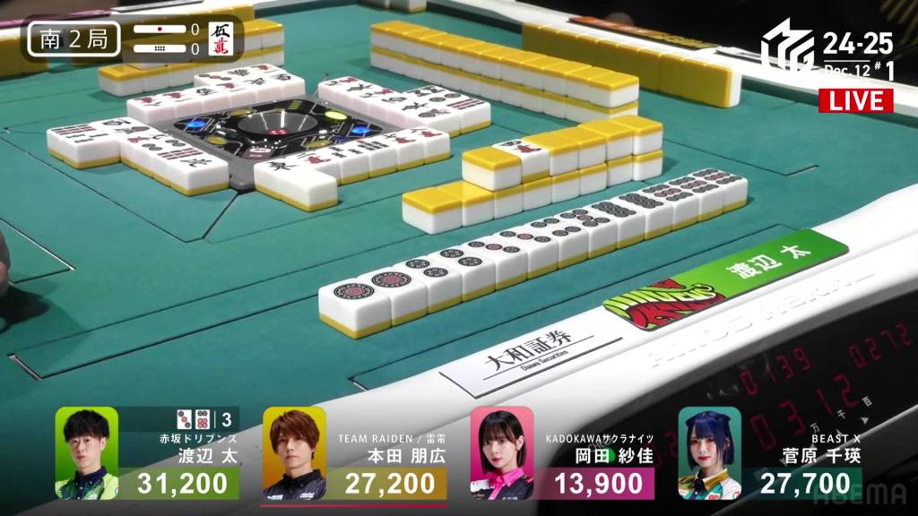 On Hagiwara’s very next draw, he incredibly gets the west and wins the hand! With a Double South/Dora 1/Aka 1 win for 2,000+100/4,000+100 plus a riichi stick, Hagiwara finishes the game in 2nd place and moves Team Raiden back into positive position.