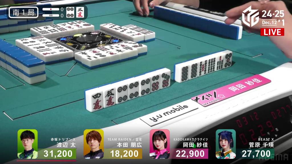 In S1-0, Hagiwara is the dealer in 4th place and 4,400 behind 3rd place Taro.