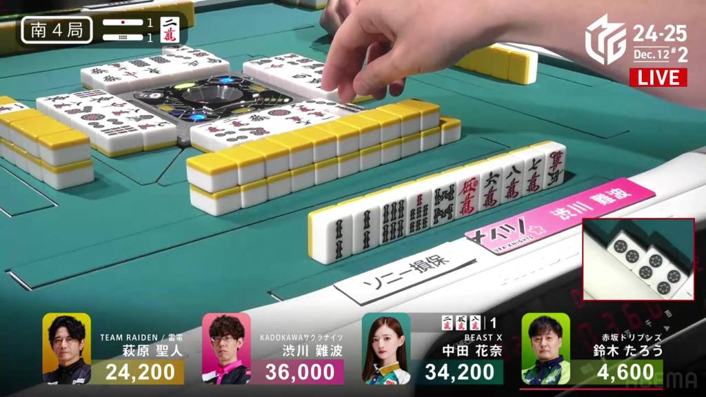 On Hagiwara’s next draw, he makes a triplet of the double south. With mangan in sight, he takes aim for a potential takeover. With a 234m chii, he gets to mangan tenpai and waits on a west tanki. Two remain in the wall.
