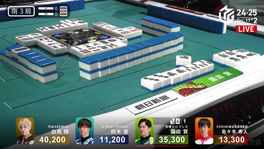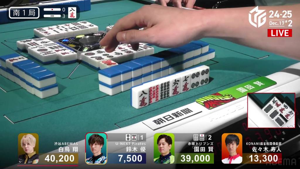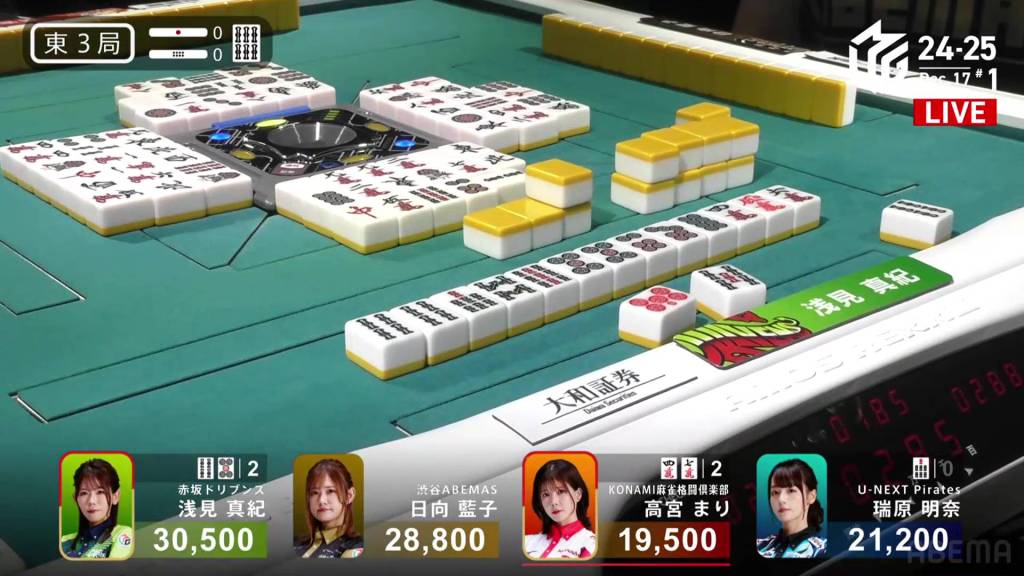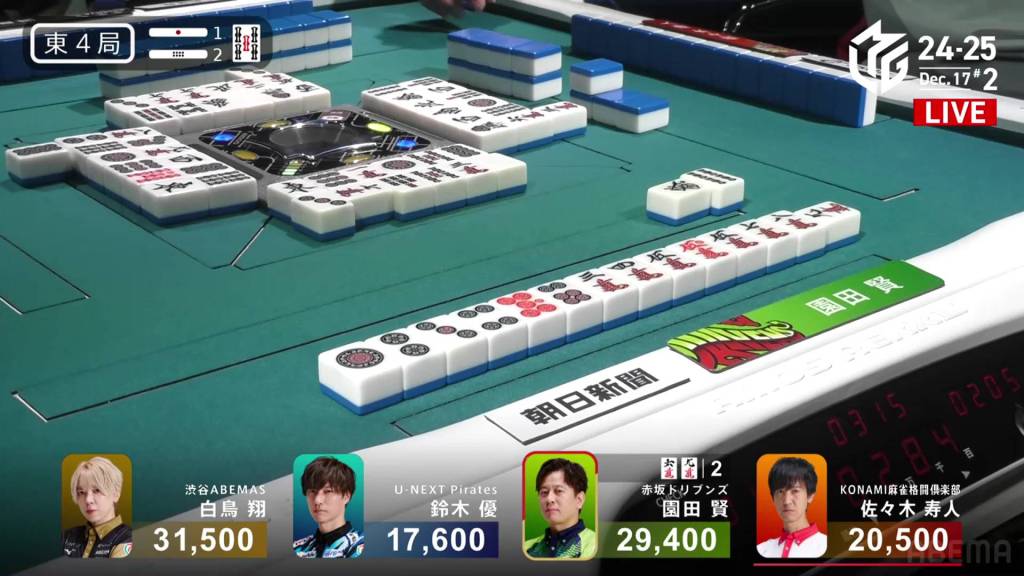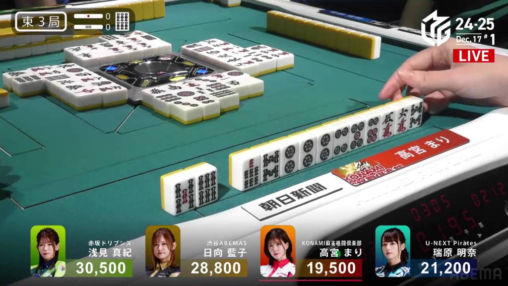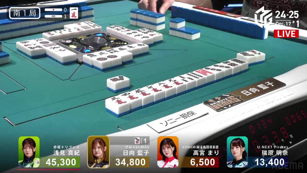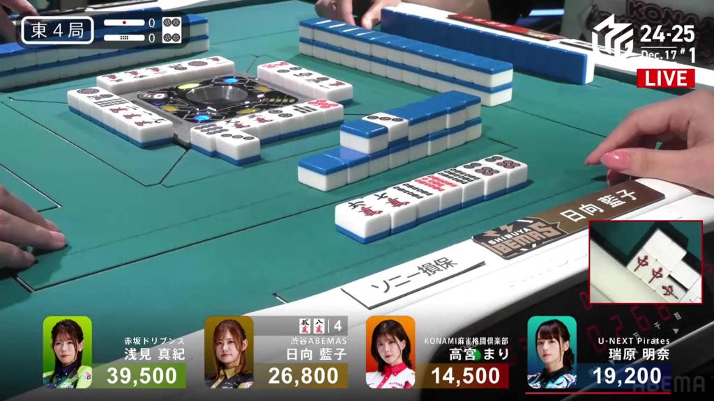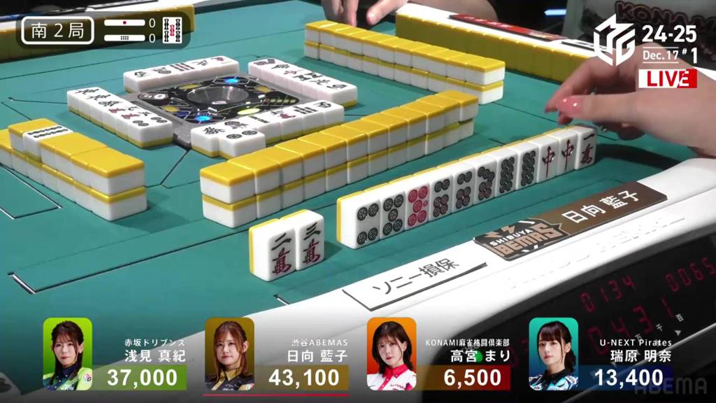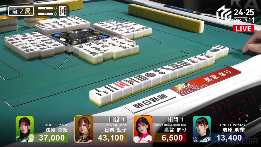 However, in the third row, Takamiya manages to pair up the 9p to get to tenpai and calls riichi on a 47s ryanmen, guaranteed at least a mangan if she wins. Late in the row, Hinata draws and discards the 7s and deals into Takamiya. With Takamiya’s 9p pair also being the uradora, Takamiya wins the hand with Riichi/Pinfu/Dora 2/Aka 1/Ura 2 for 12,000, moving Takamiya into 3rd place and Hinata into 2nd place.