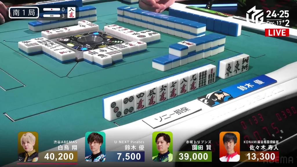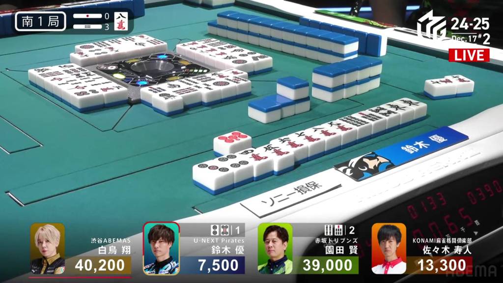 To his right, Sonoda is aiming for 1st place, needing any win to move ahead. Sitting iishanten and unlikely to fall into 3rd place anytime soon, Sonoda keeps moving forward. At the end of the second row, Sonoda calls a 456m chii and gets to tenpai on a 47s ryanmen. Unfortunately, on his very next turn, Sonda draws and discards the red 5p and deals into Yu.