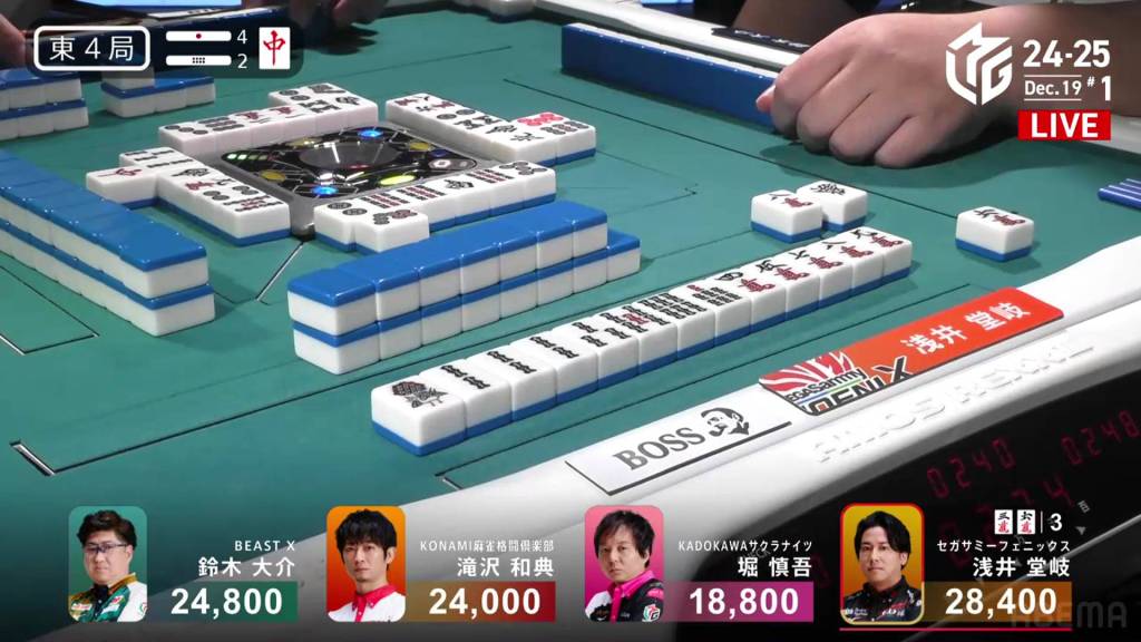 In E4-2, Takaki is the dealer in 1st place and holds a 3,400 lead over 2nd place Daisuke. WIth four riichi sticks and two honba in the pot, the next winner will have a big bonus of 4,600.