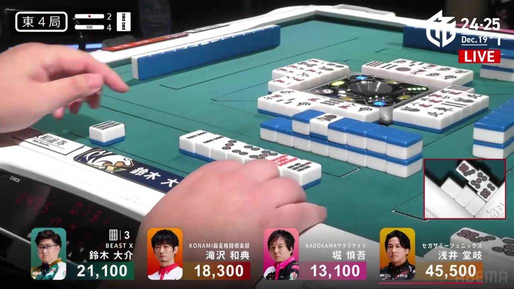 While all this was going on, Takizawa patiently built his hand, creating sequences and loosely connecting the dora 2p. Right after Daisuke gets to tenpai, Takizawa calls riichi and waits on a 3p kanchan.