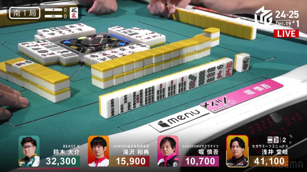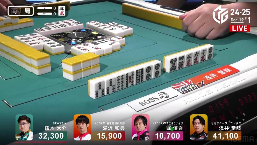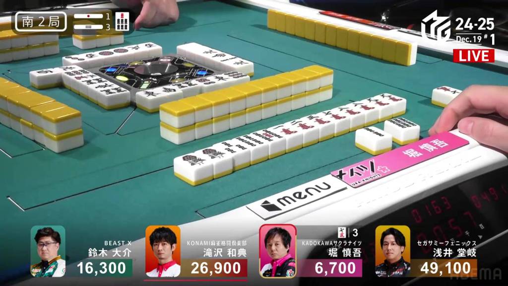 In the second row, Takaki gets himself to a perfect iishanten while Hori connects the double dora with a 4m. In the middle of the row, Takaki is the first to tenpai and calls riichi on a 47p ryanmen.