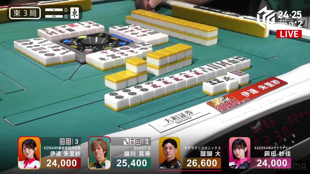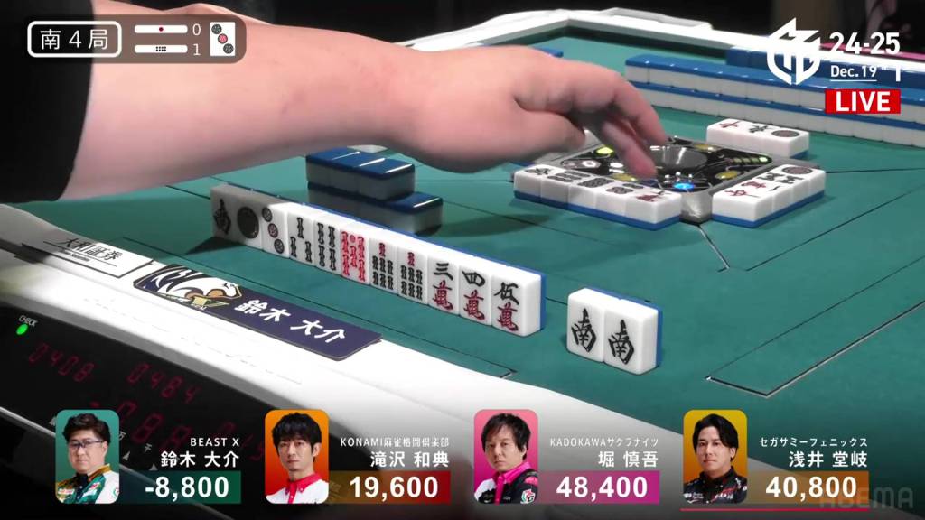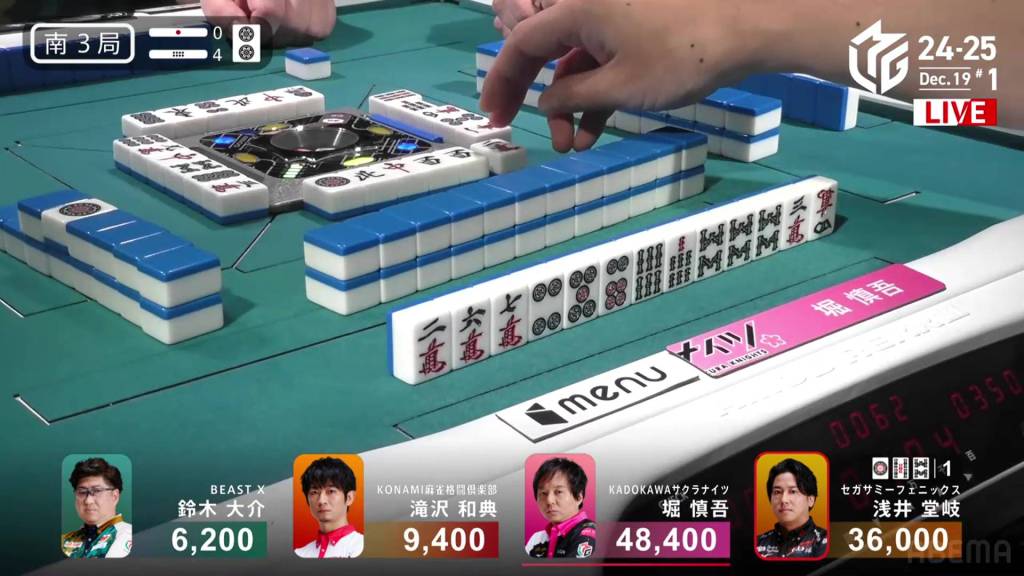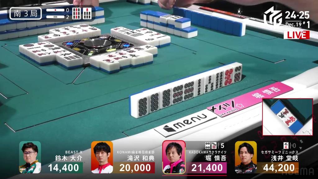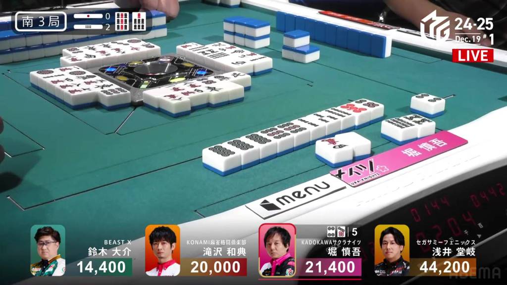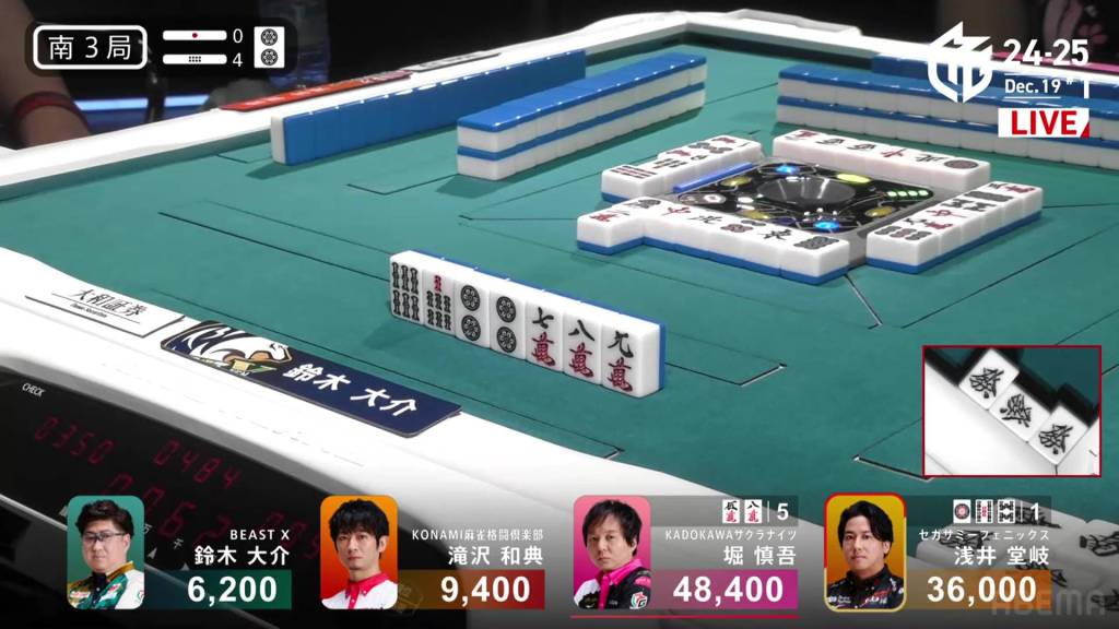 In S2-3, Hori is in 4th place and chasing after 3rd place Daisuke who is 9,600 ahead of him. A riichi stick and three honba are in the pot.