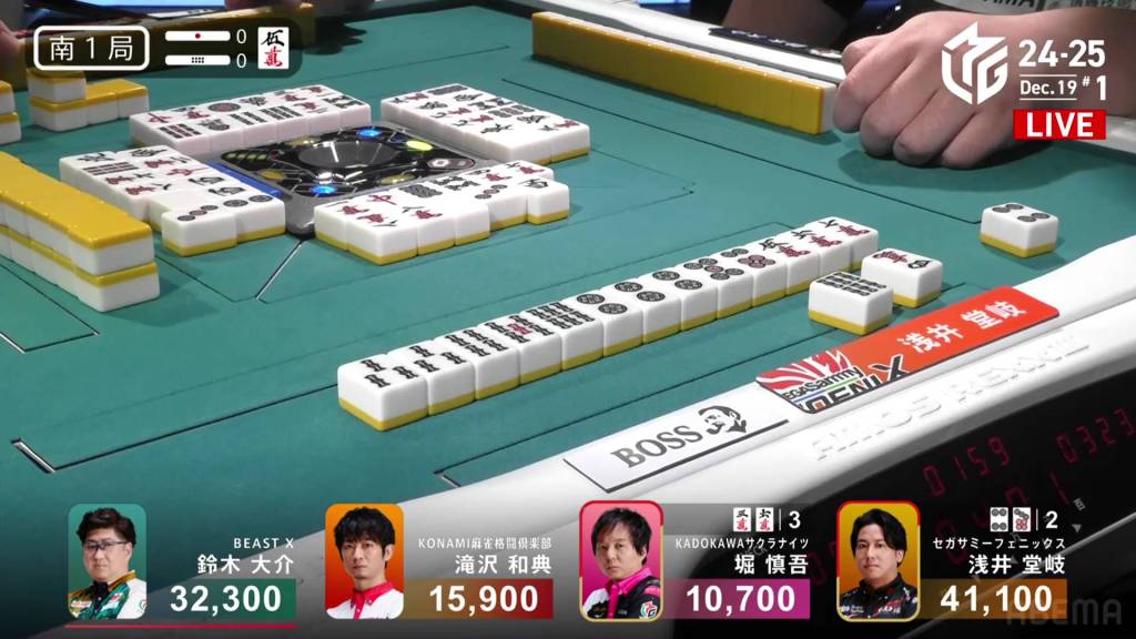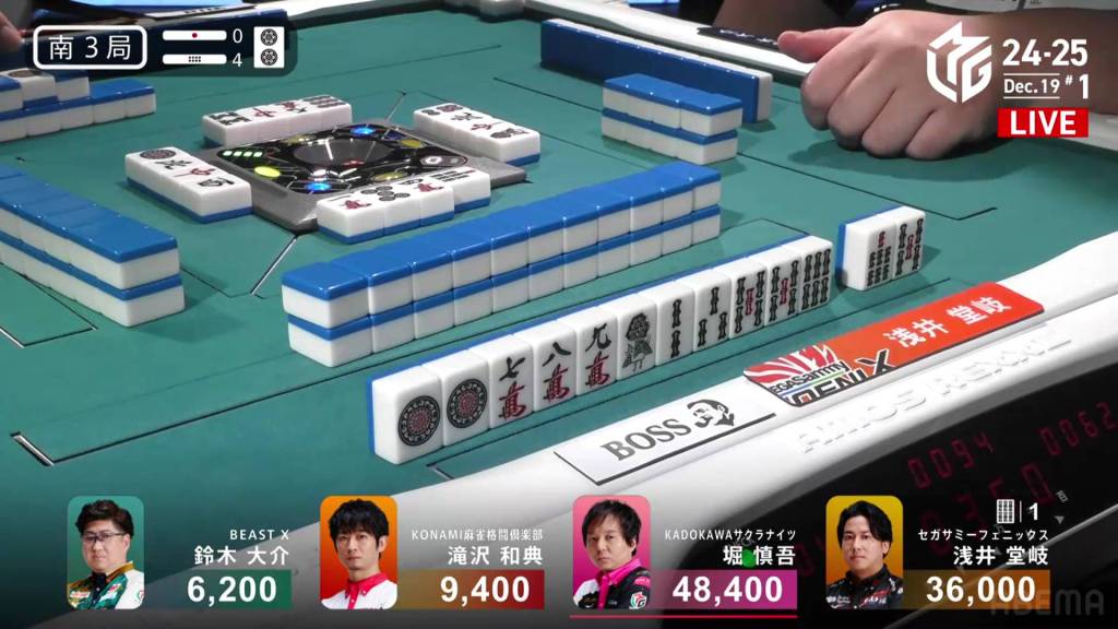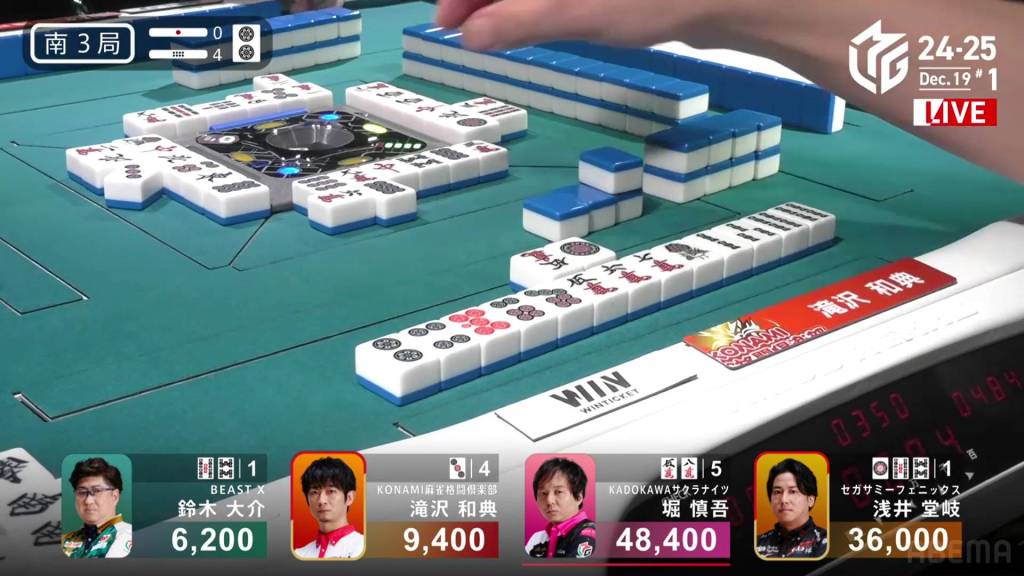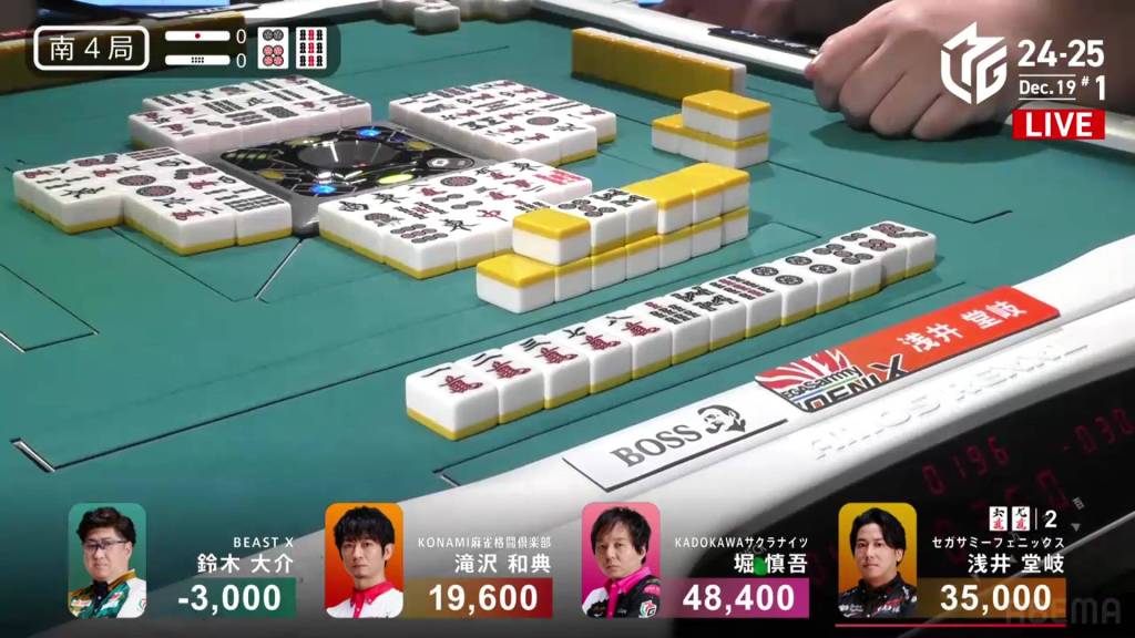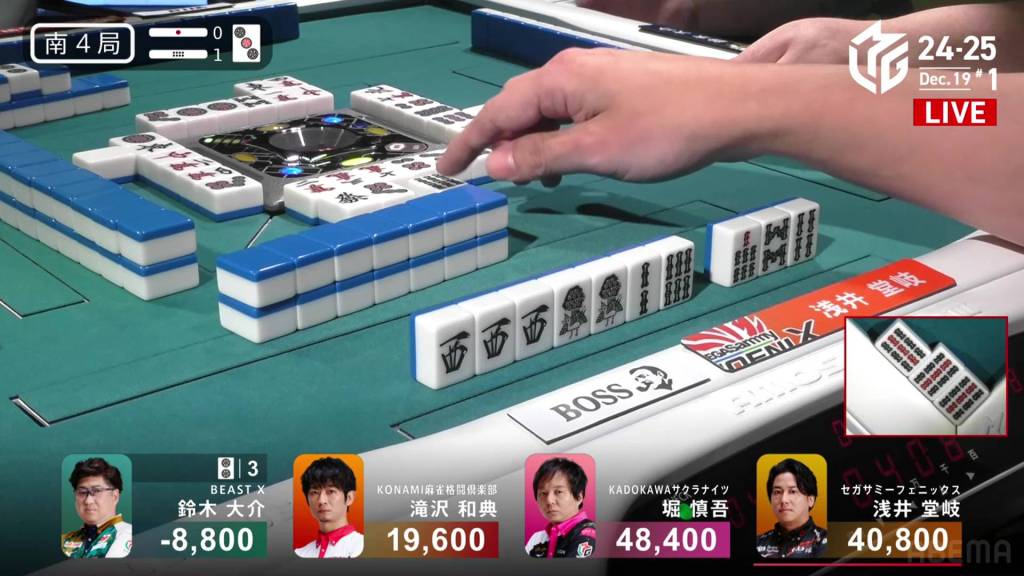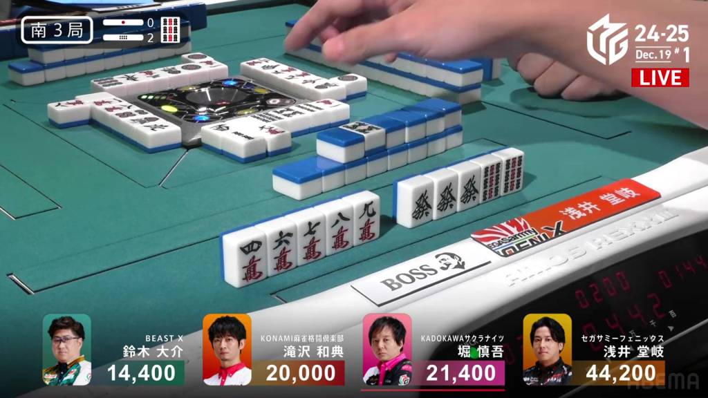 In S2-3, Hori is in 4th place and chasing after 3rd place Daisuke who is 9,600 ahead of him. A riichi stick and three honba are in the pot.