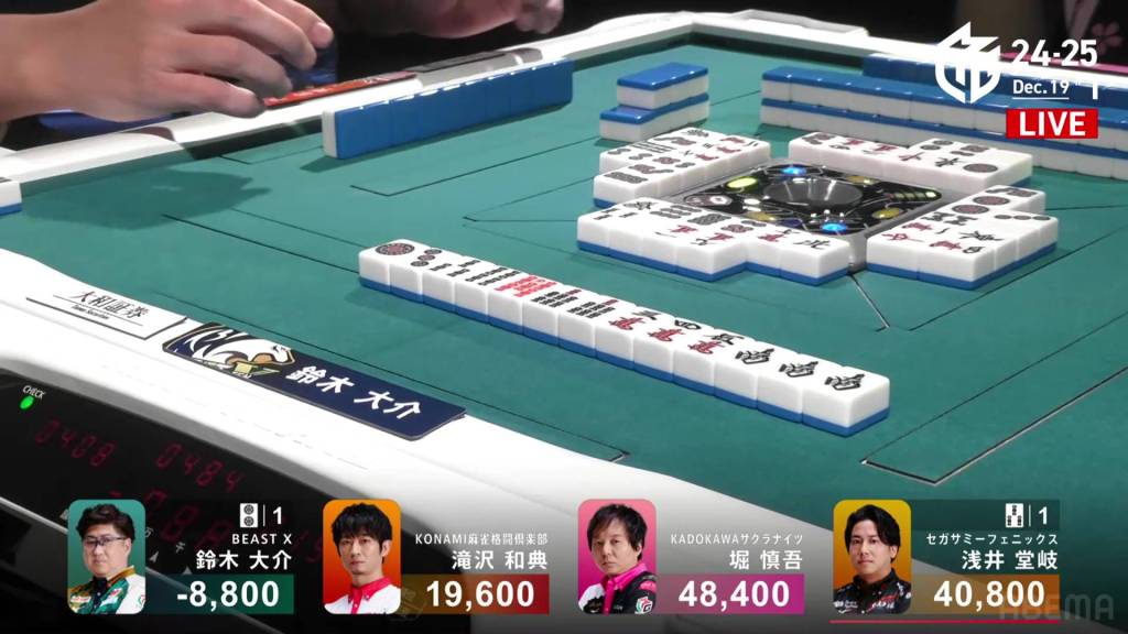 Just two turns later, Takaki draws the 4p and wins the hand. Takaki wins with Riichi/Tsumo/Tanyao/Dora 1 for 8,000. With Hori’s riichi stick, it takes Takaki’s score to 50,100.