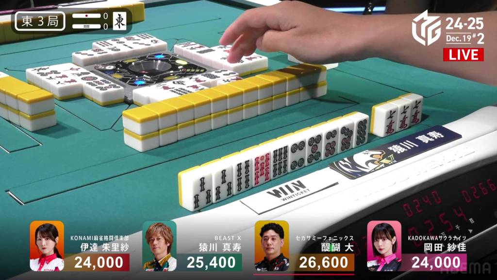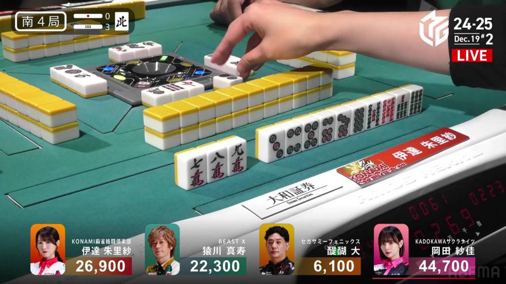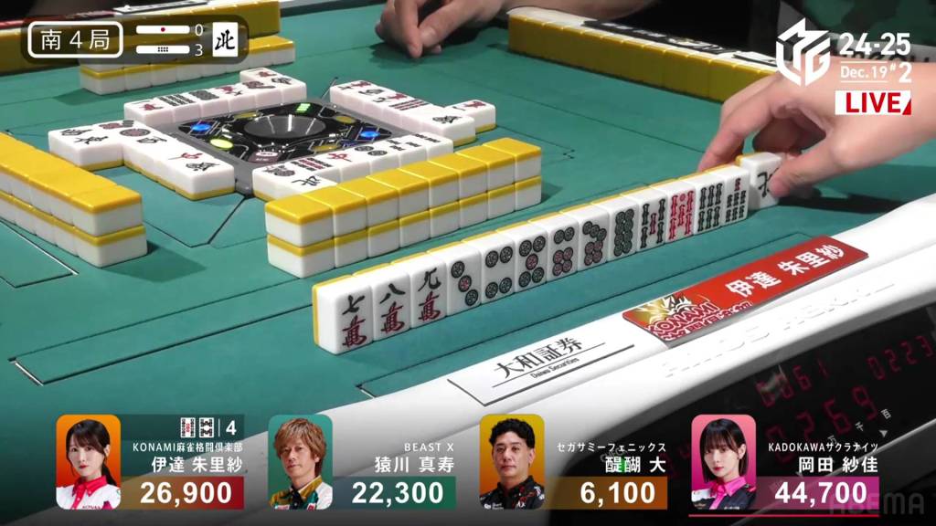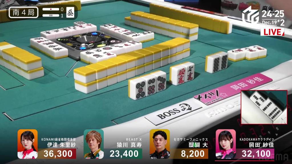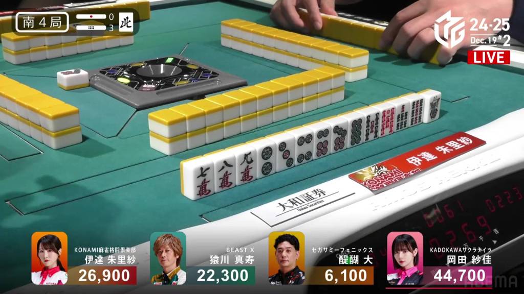 With Okada’s 3p pair being the uradora, Okada wins the hand with Riichi/Ura 2 for 7,700+600, a big hit off her biggest rival. With the win, the lead by Okada is now at 17,800, a very difficult amount to overcome.