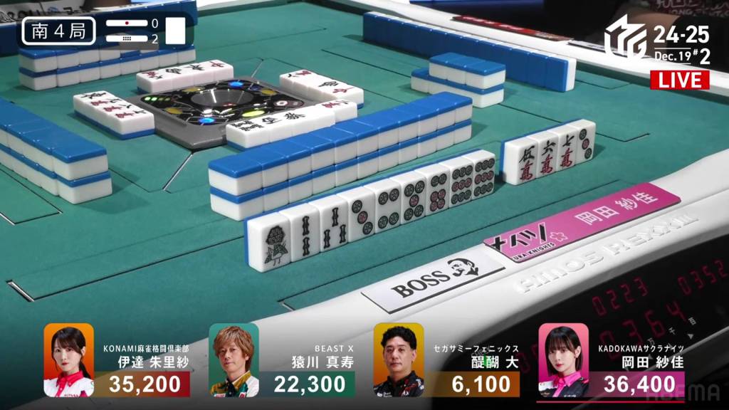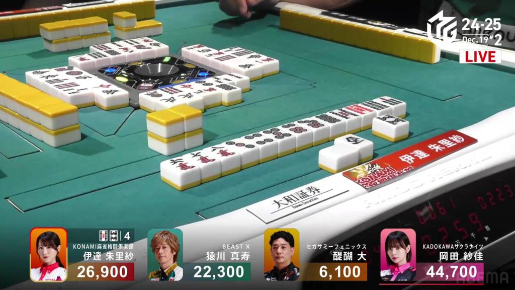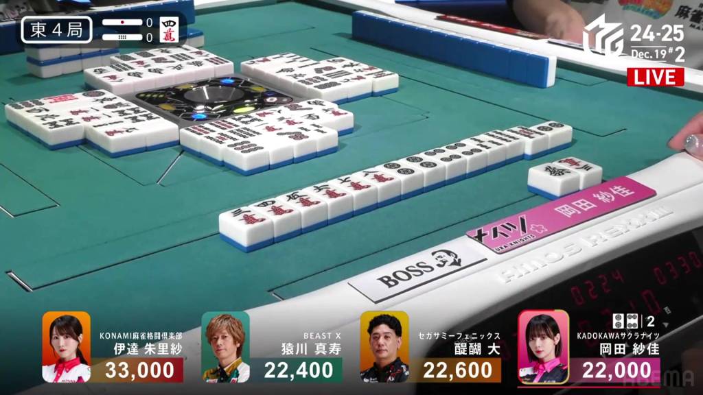 In E4-0, Okada is the dealer in 4th place, less than 1,000 behind the middle two players and 11,000 behind 1st place Date. WIth a dealership, a mangan is enough for top spot.