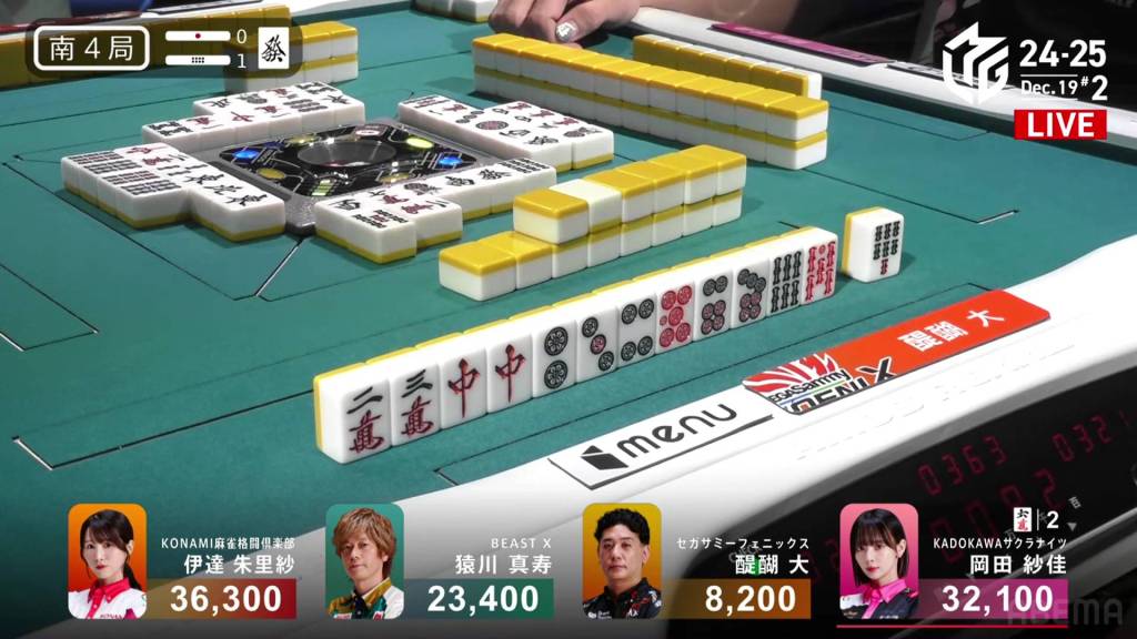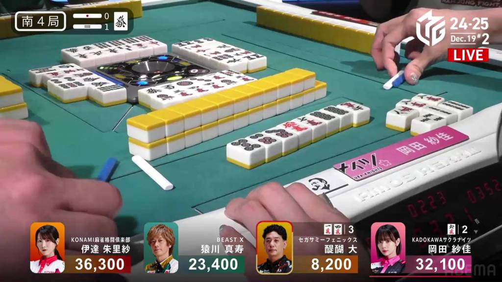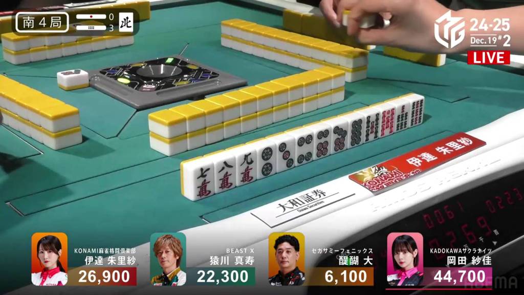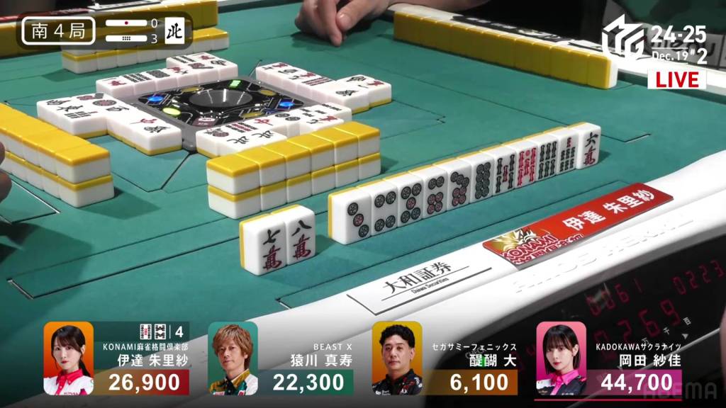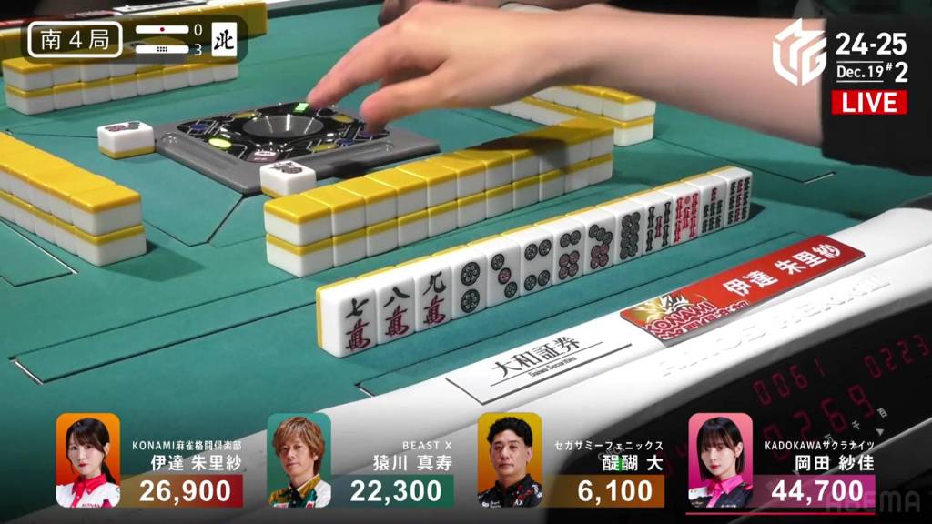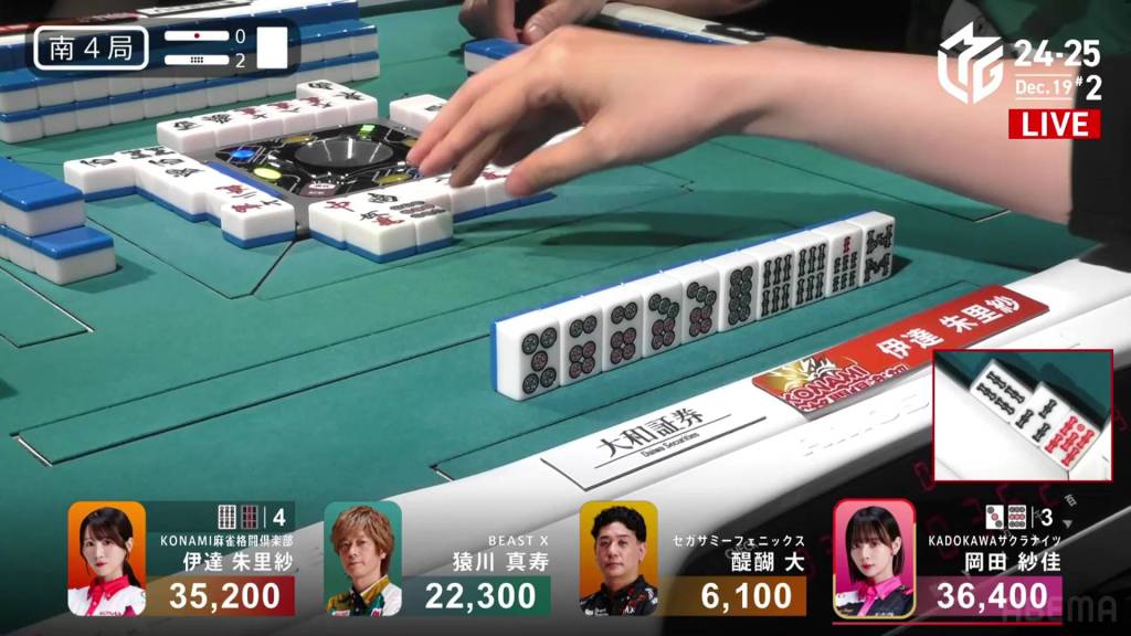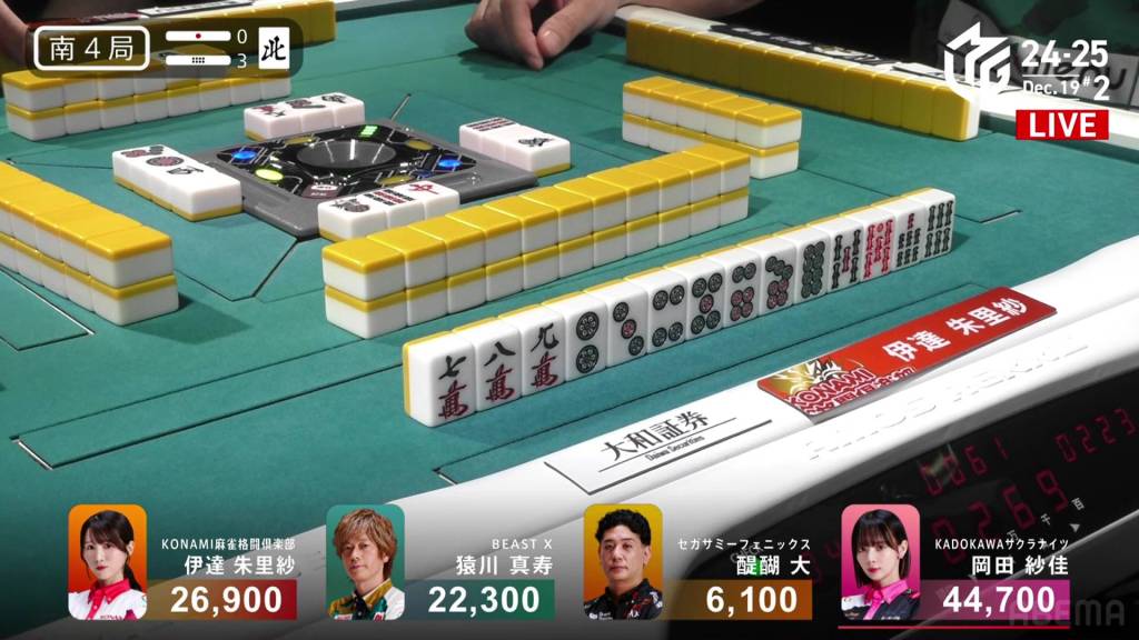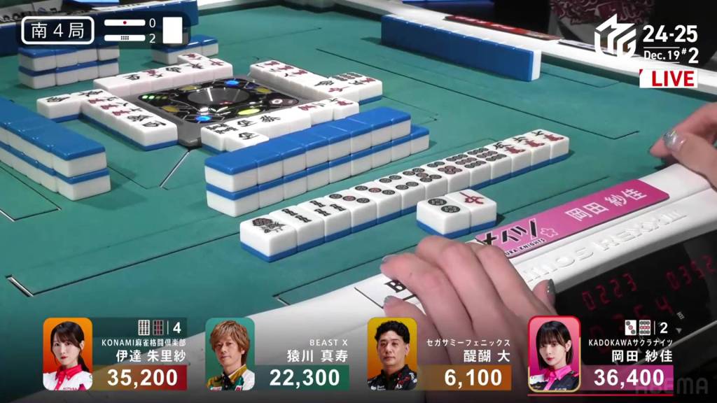 In S4-1, Okada is the dealer in 2nd place and sitting 4,200 behind 1st place Date. Looking for her first 1st of the season, a win in this hand could be the key to getting that 1st.