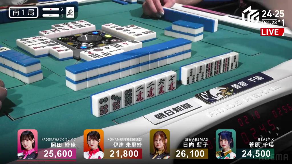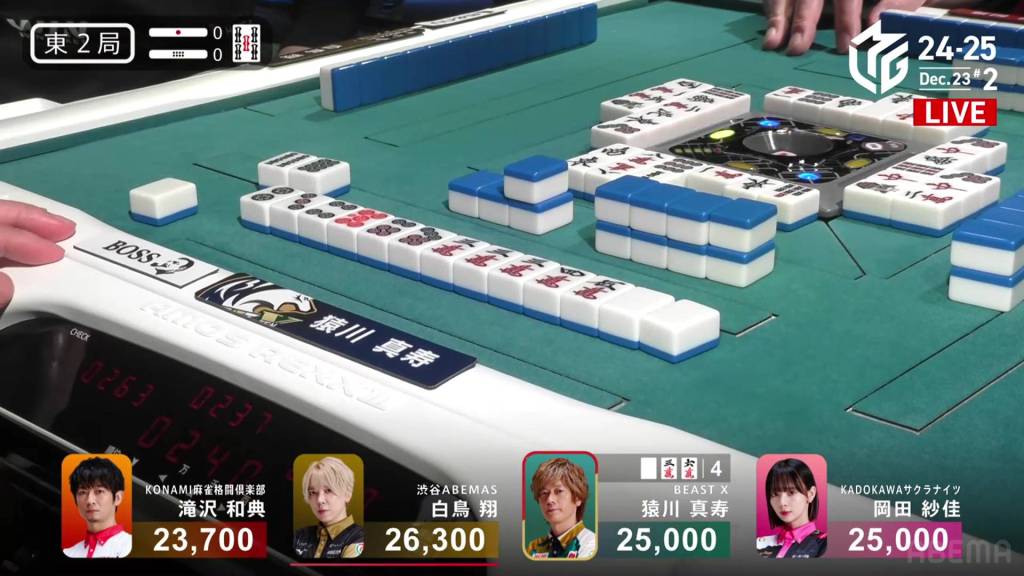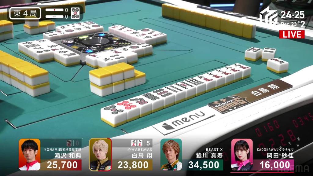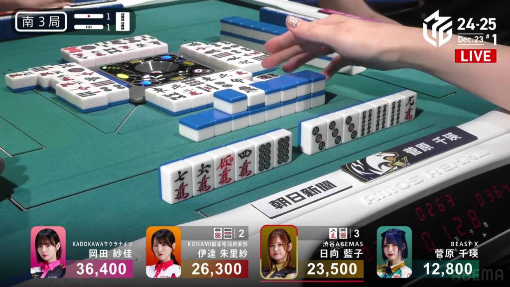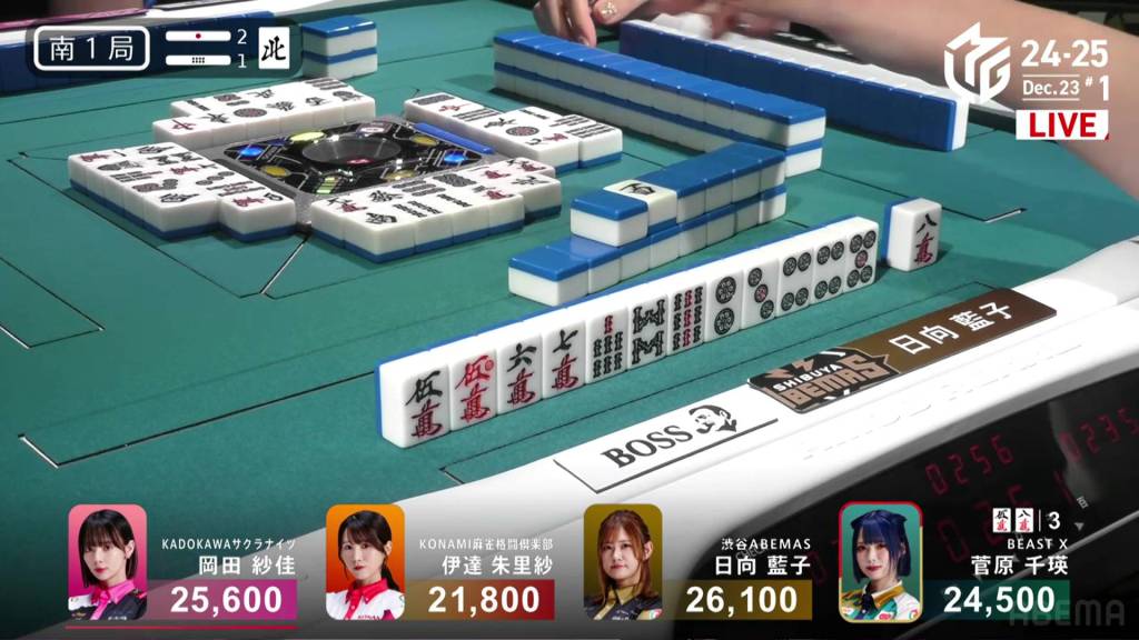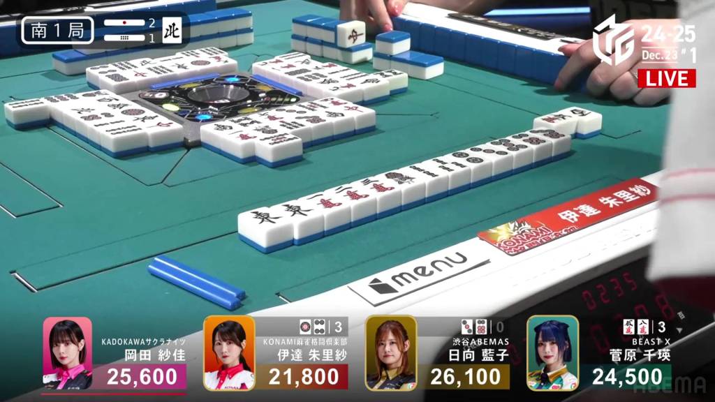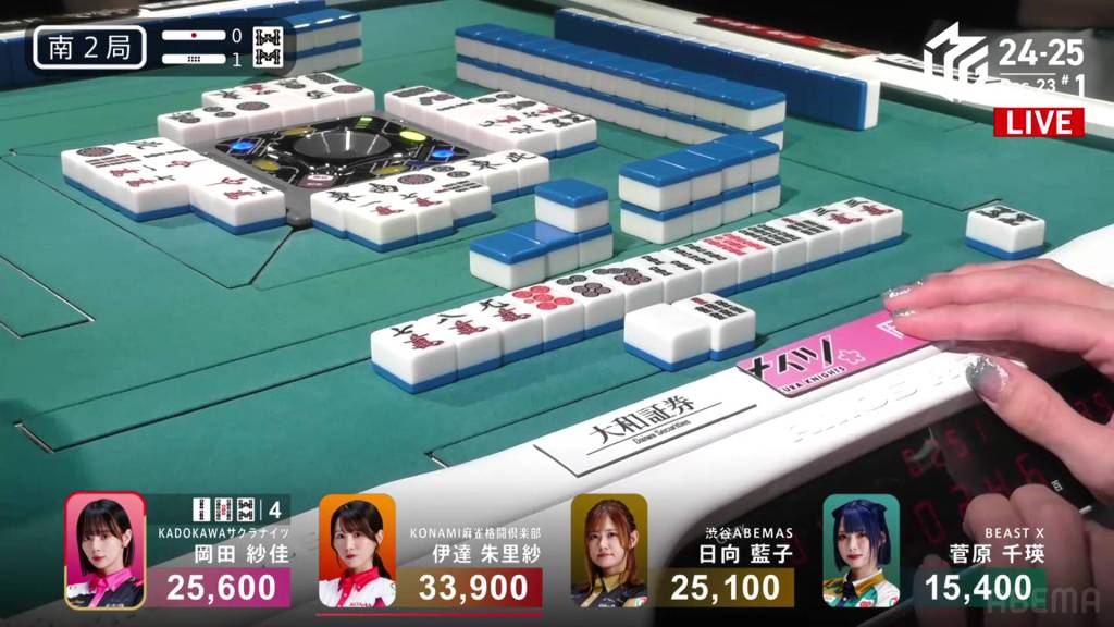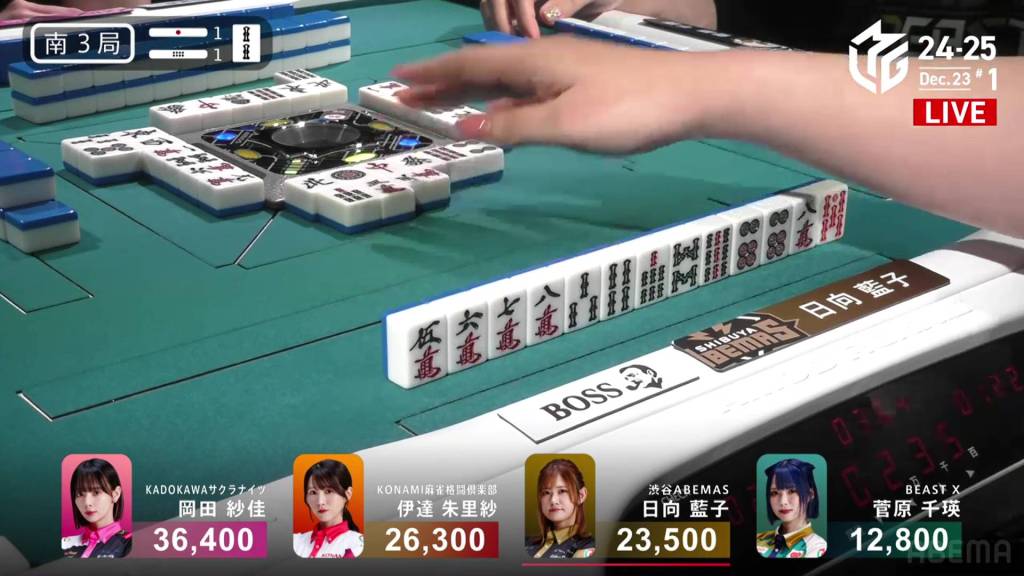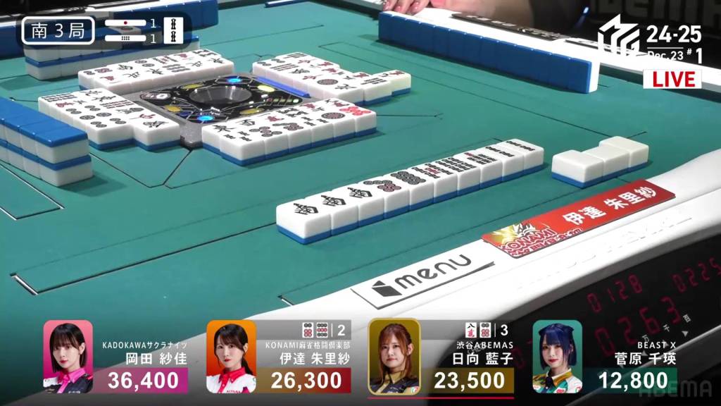 In S1-1, a fairly calm hand has led to a close game, with 1st place Hinata and 4th place Date separated by only 4,300. With 2,300 in the pot, a win here by anyone will be significant.