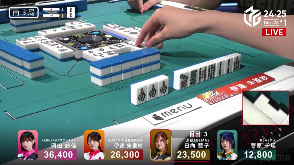 In S3-1, Date is in 2nd place and 10,100 behind 1st place Okada. With a riichi stick and a honba on the table, a mangan tsumo would be enough for her to move into 1st place.