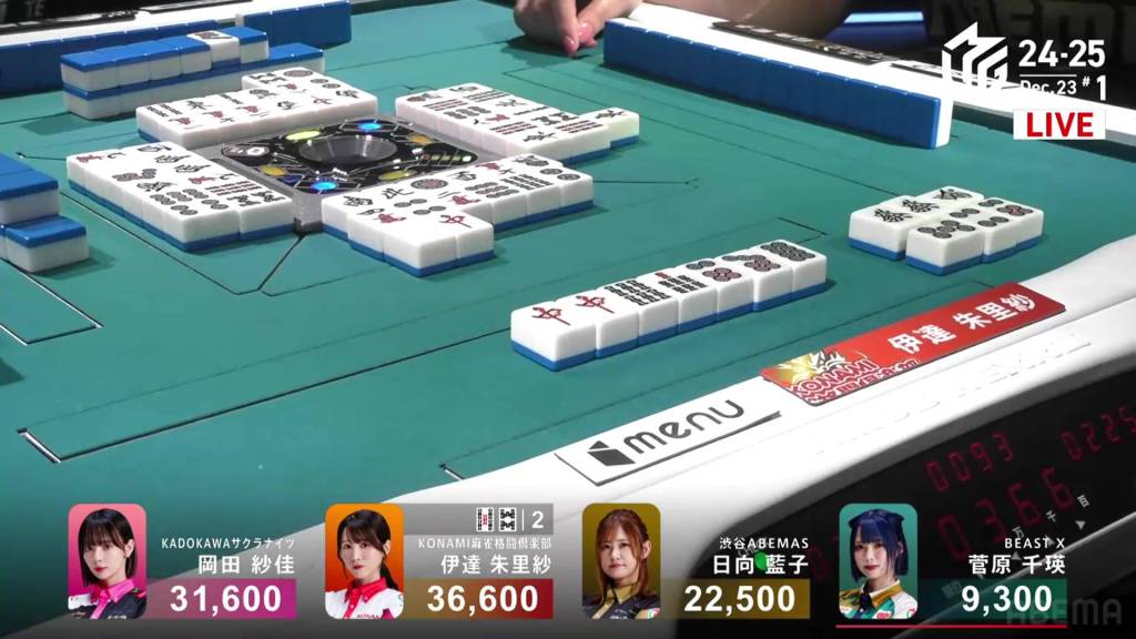 After pushing the once-cut red dragon during the ippatsu round, Date draws the 3s on her next draw. With the tenpai, Date calls riichi and waits on a 14p ryanmen. Within the go-around, Sugawara draws and discards the 4p and deals into Date. After Date’s hand explodes and she sorts it back together Date wins the hand with Riichi/Ippatsu/Pinfu for 3,900+300 plus four riichi sticks, moving into 1st place with exactly 30,000.