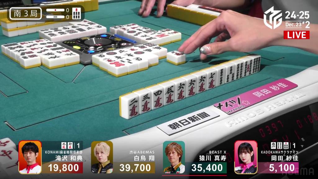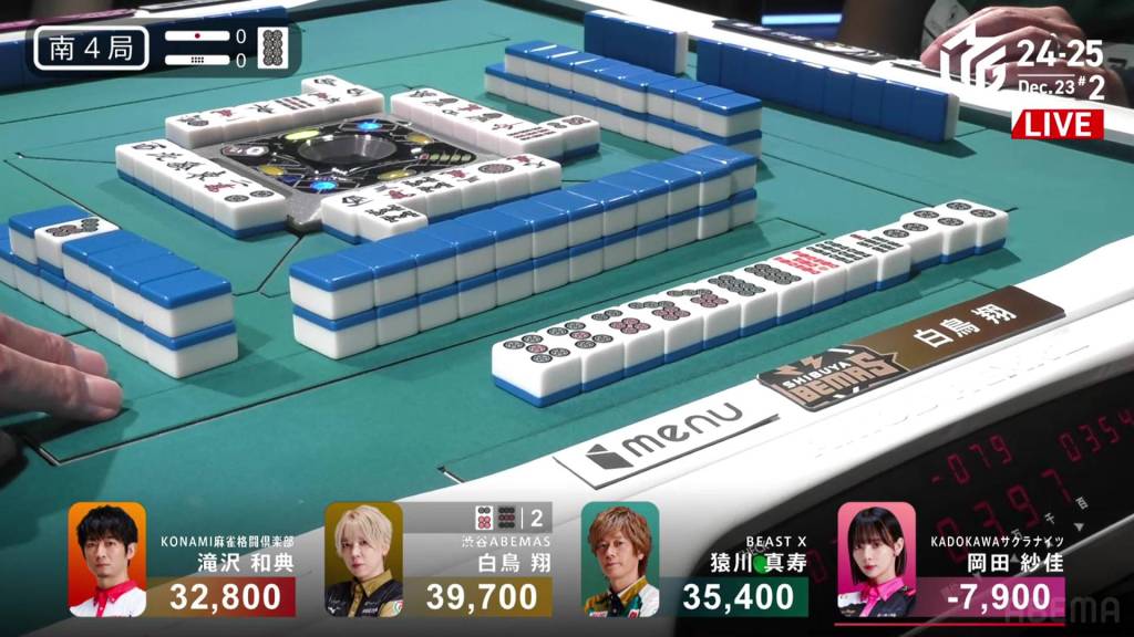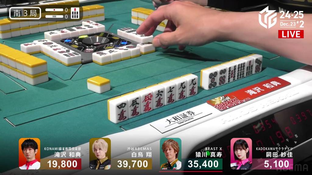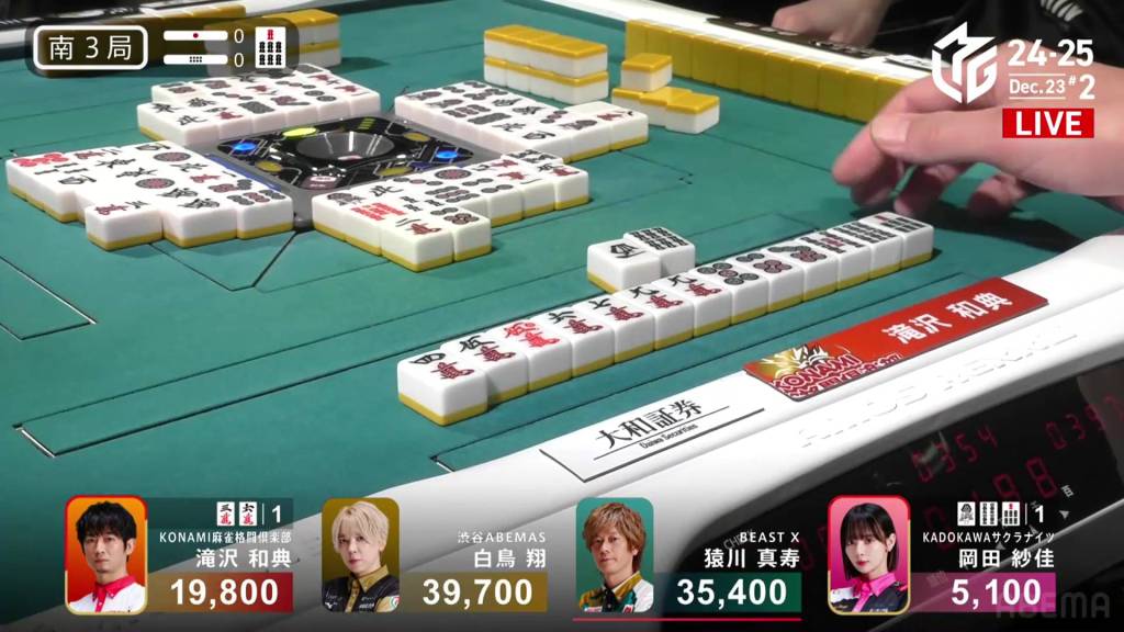 In S3-0, Takizawa is in 3rd place, 15,600 behind 2nd place dealer Sarukawa and 19,900 behind 1st place Shiratori. A good hand here could put him in contention for 1st place.