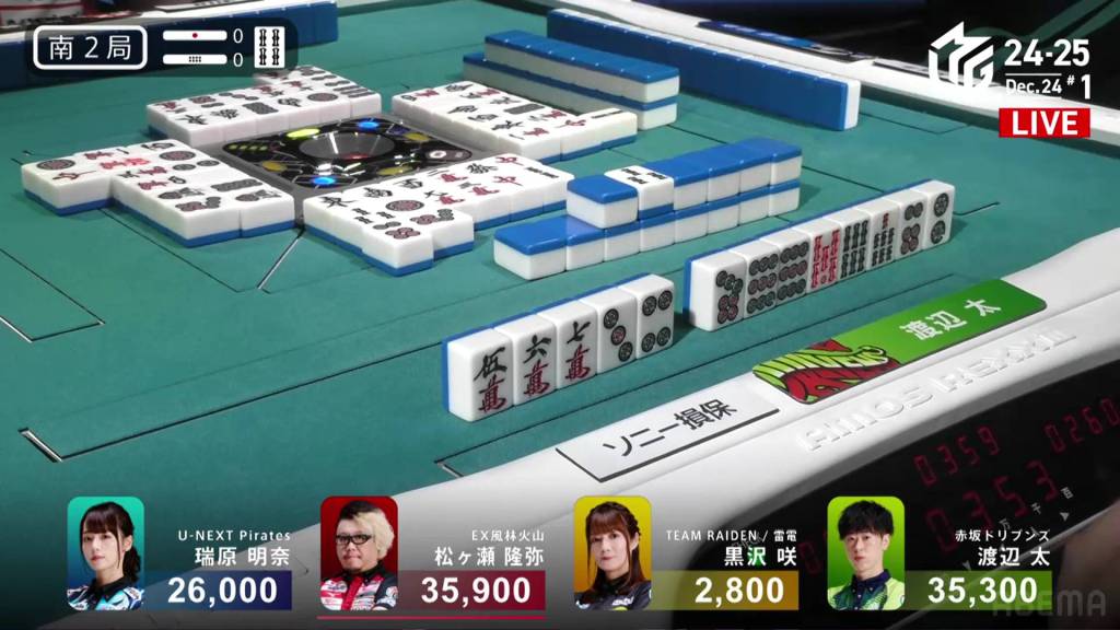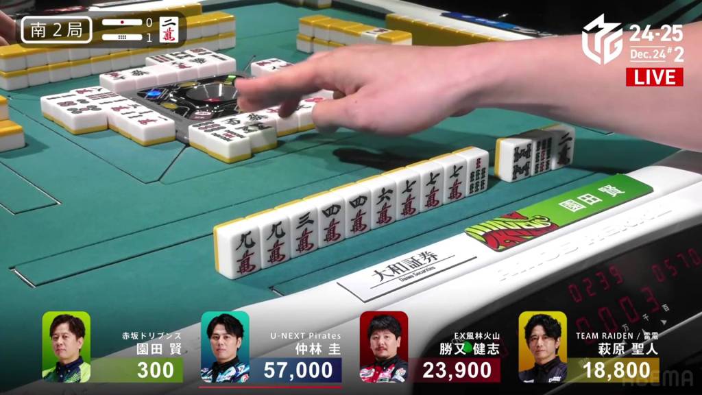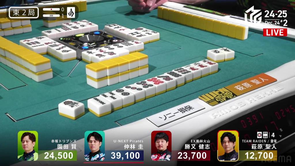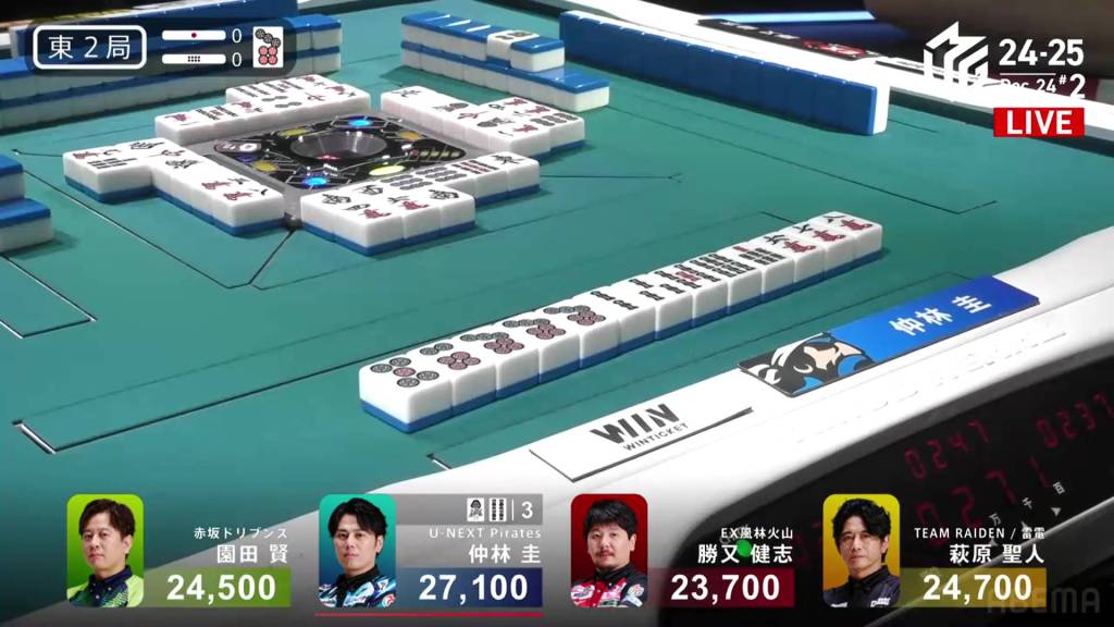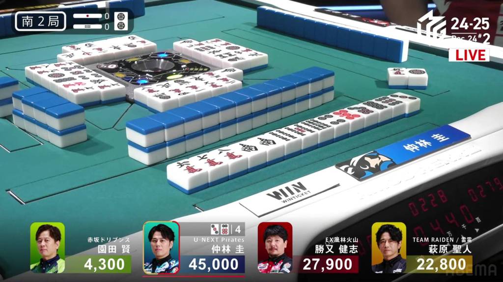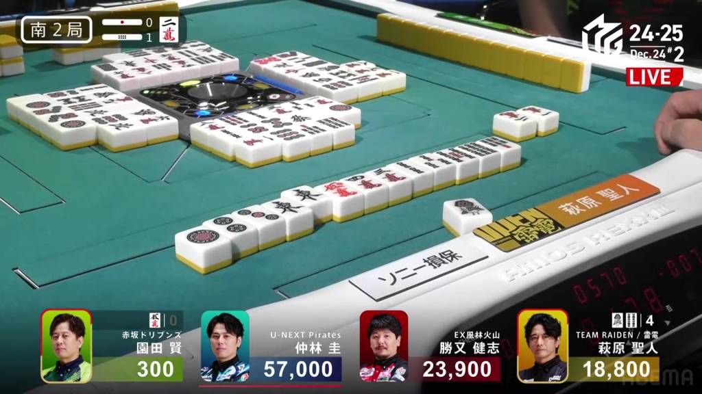 In S2-0, Nakabayashi is the dealer yet again and holds a 17,100 lead over 2nd place Katsumata.