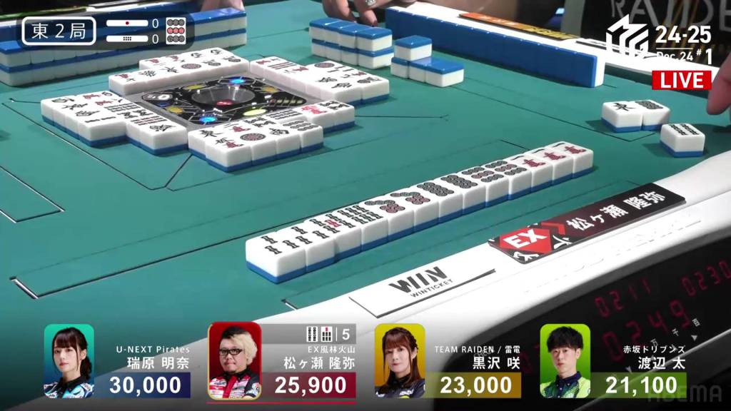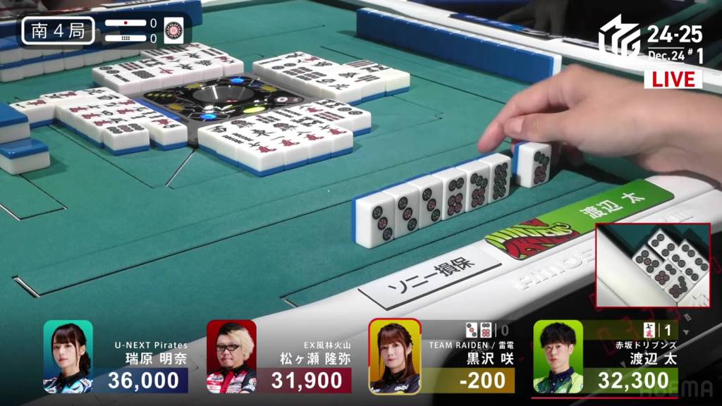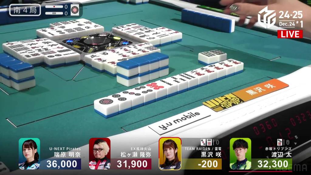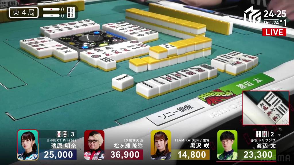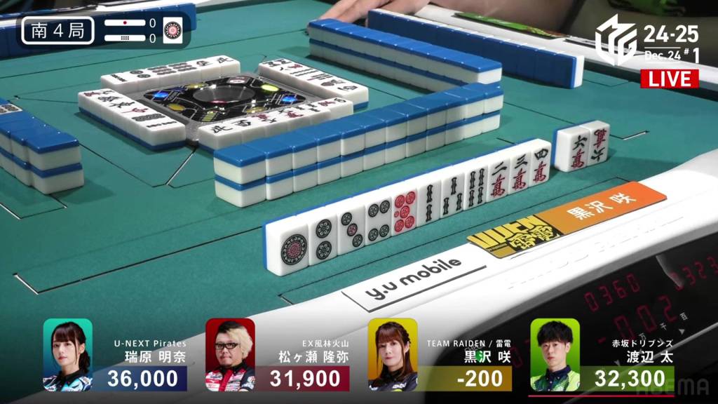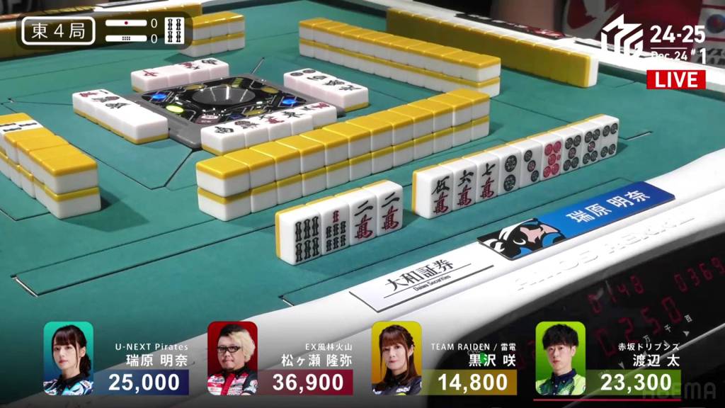 In S2-0, Nakabayashi is the dealer yet again and holds a 17,100 lead over 2nd place Katsumata.