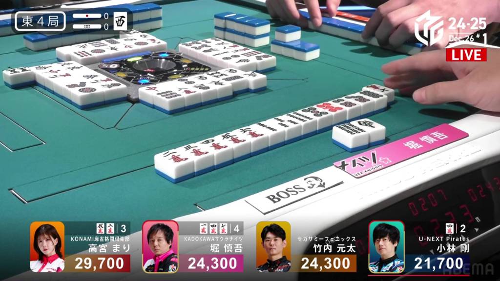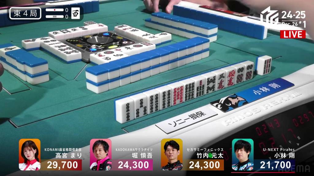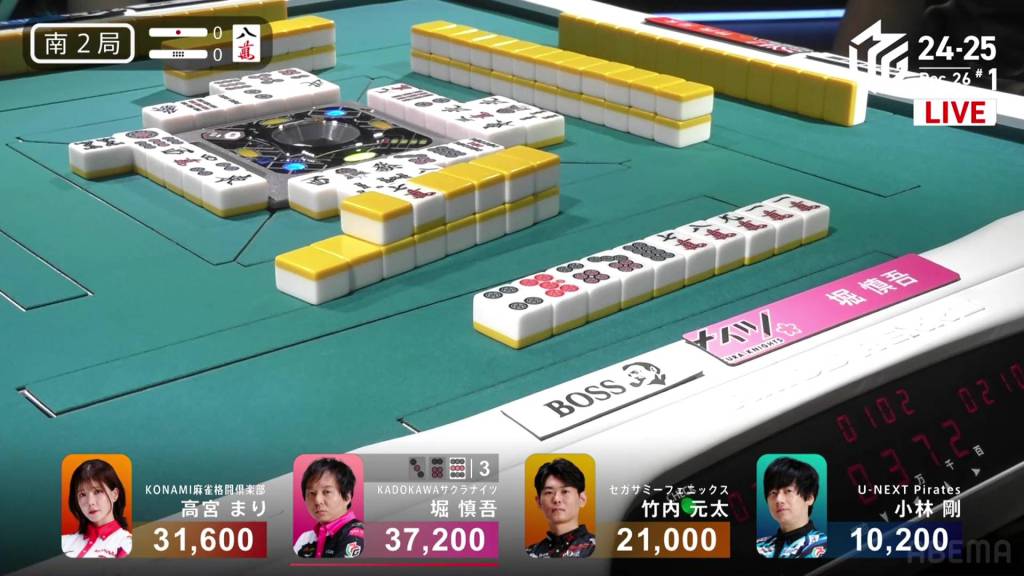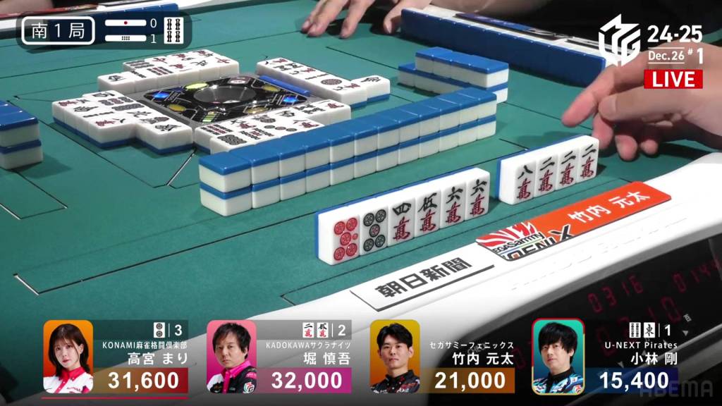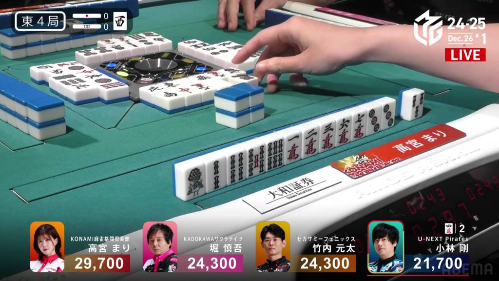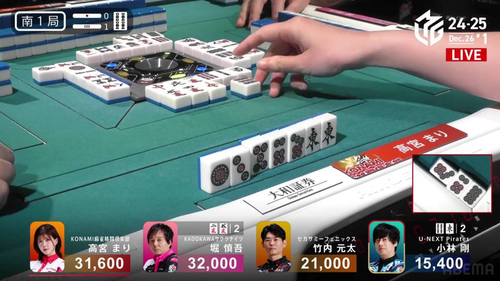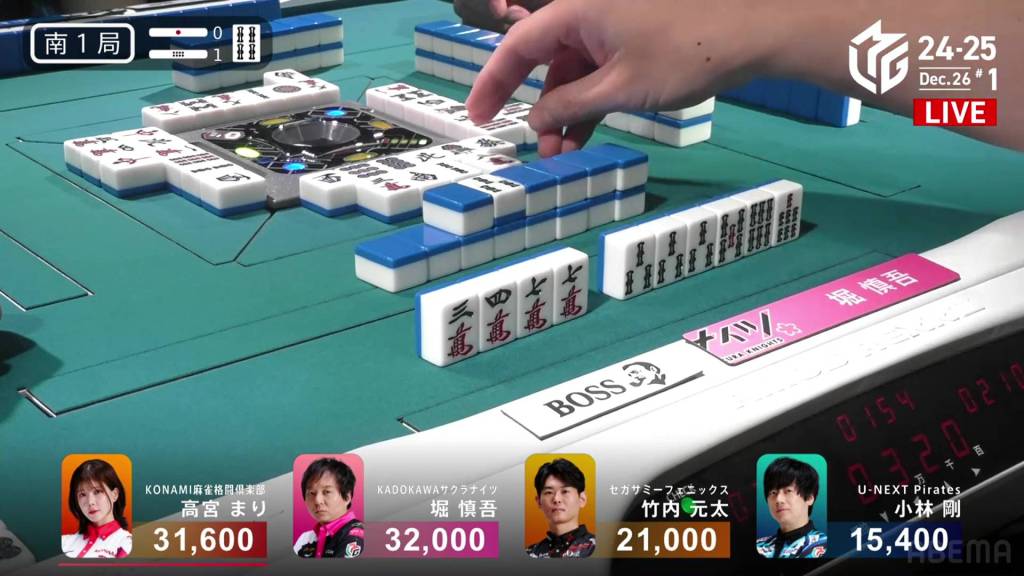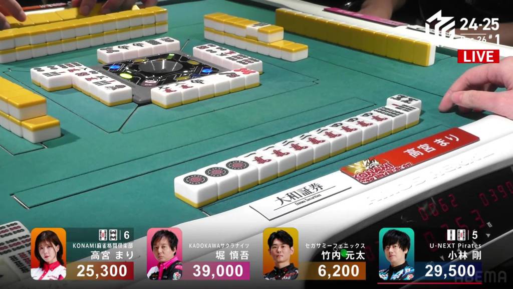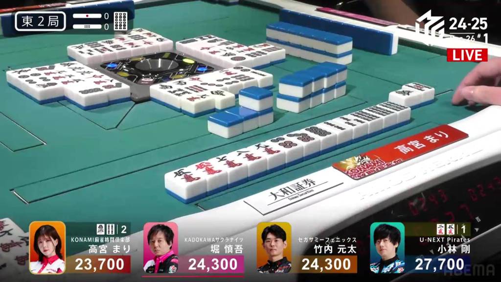 On Kobayashi’s next turn, he draws and discards the red 5m and deals into Hori. Hori wins the hand with White Dragon/Dora 1/Aka 1 for 3,900 plus Kobayashi’s riichi stick.