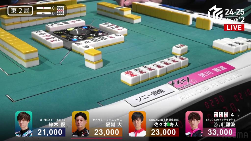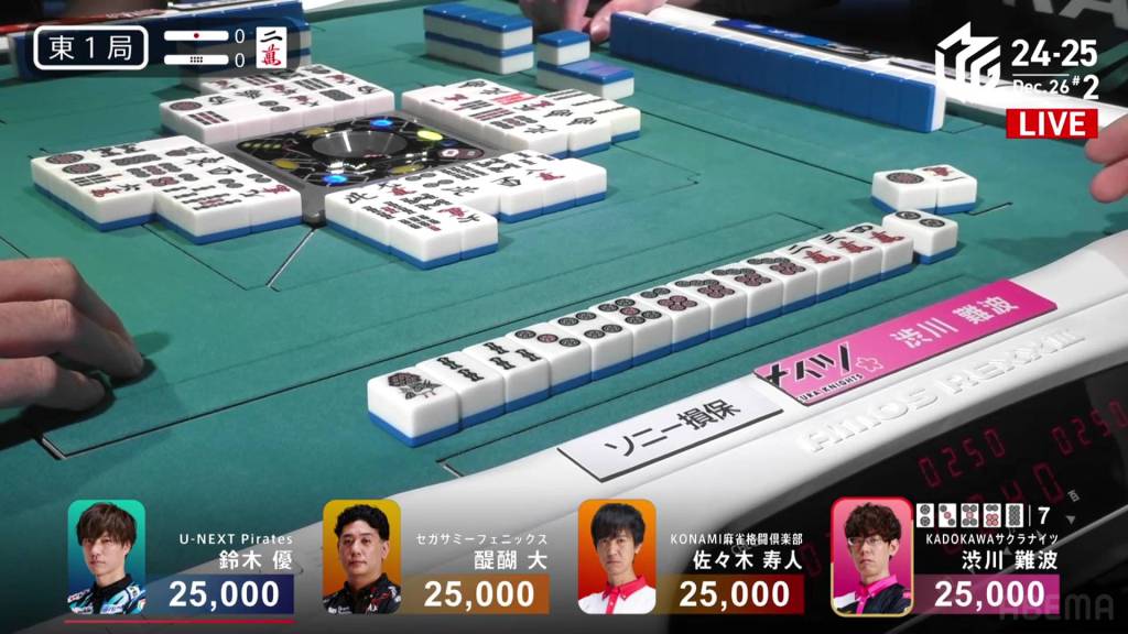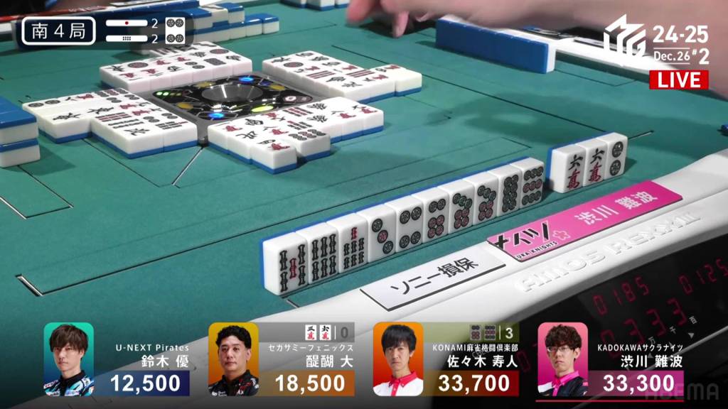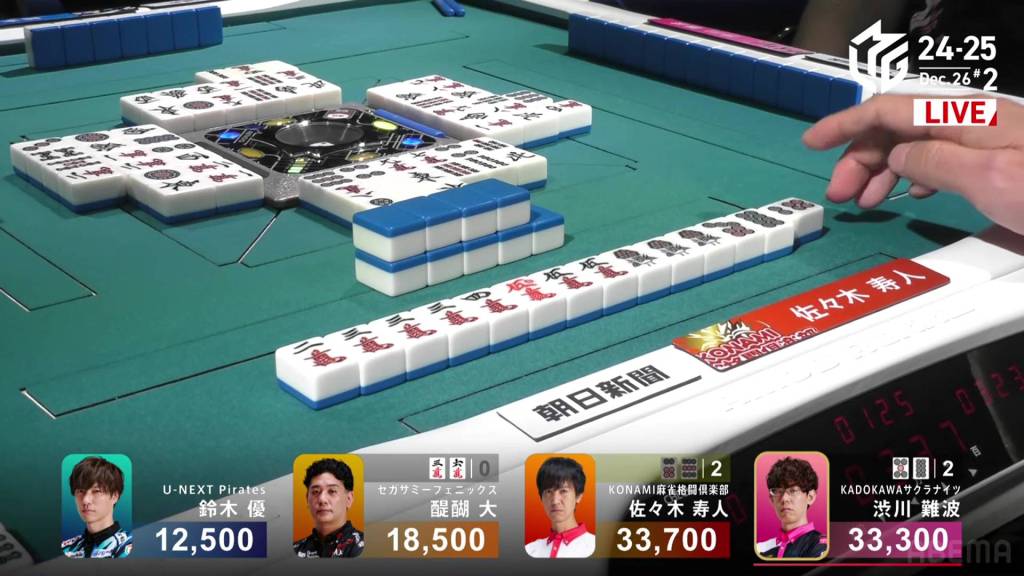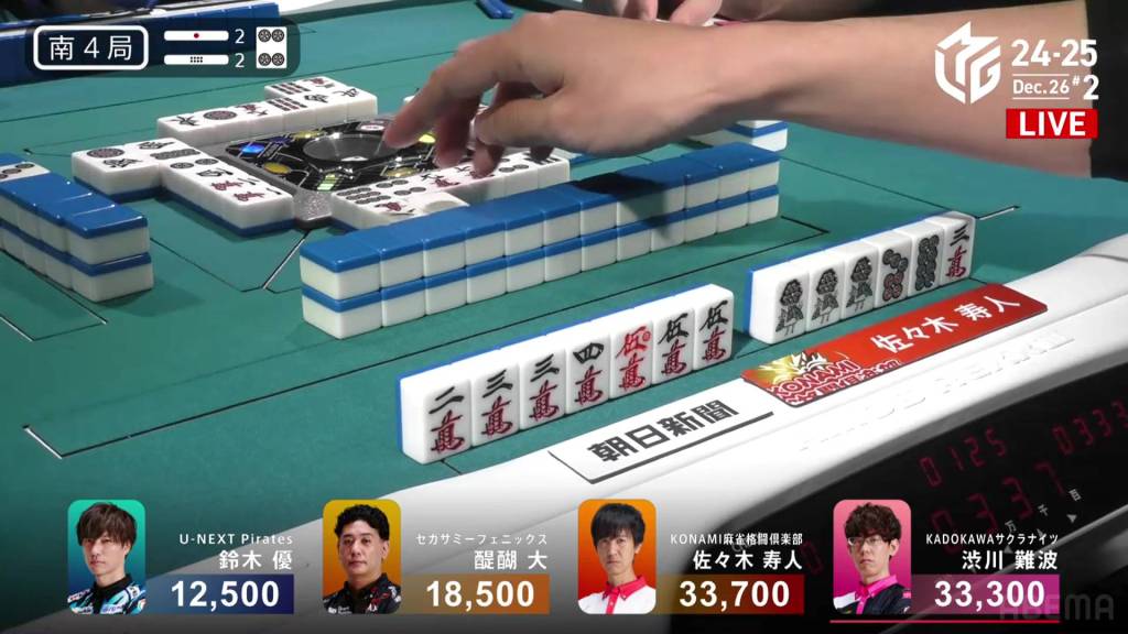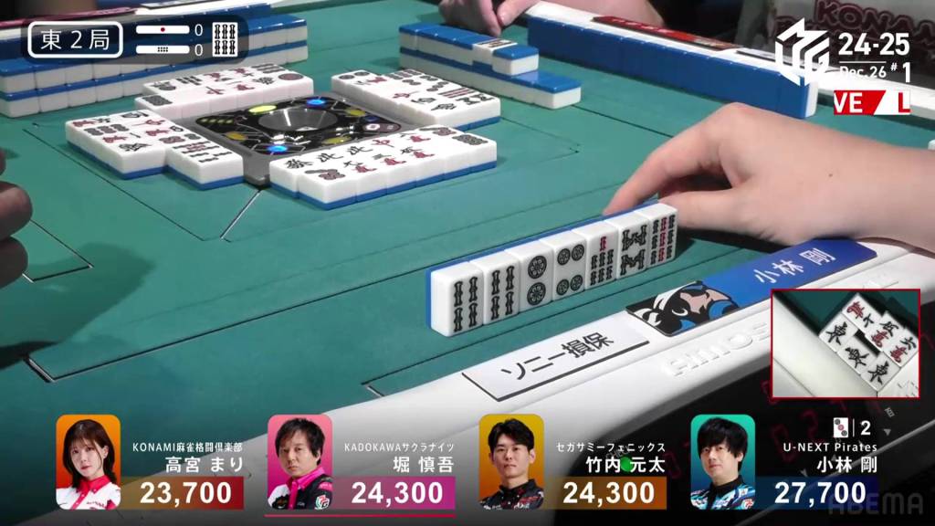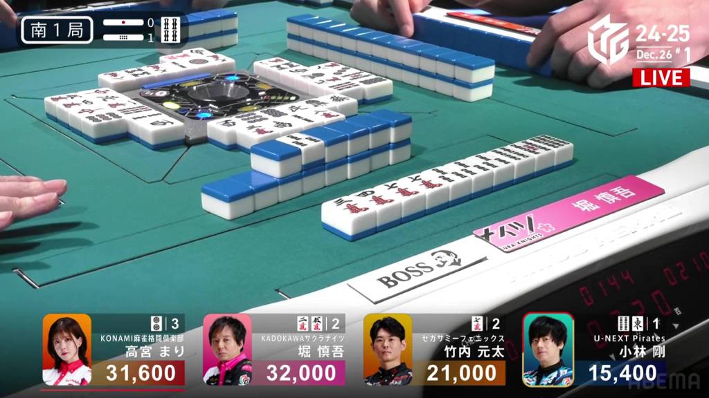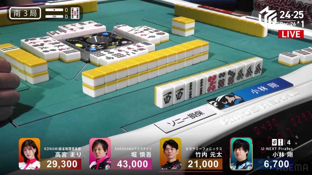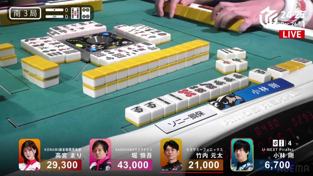 On Kobayashi’s next turn, he draws and discards the red 5m and deals into Hori. Hori wins the hand with White Dragon/Dora 1/Aka 1 for 3,900 plus Kobayashi’s riichi stick.