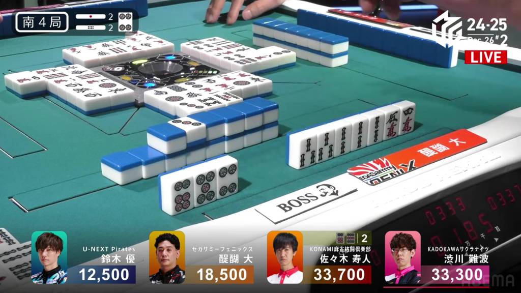 In S2-2, the scores are close at the top with 1st place Hisato and 2nd place Shibukawa separated by only 400. Two riichi sticks and two honba sit in the pot.