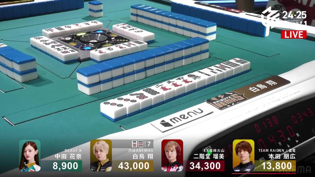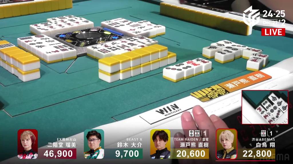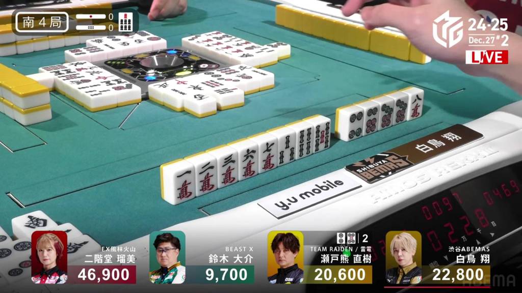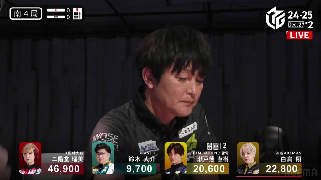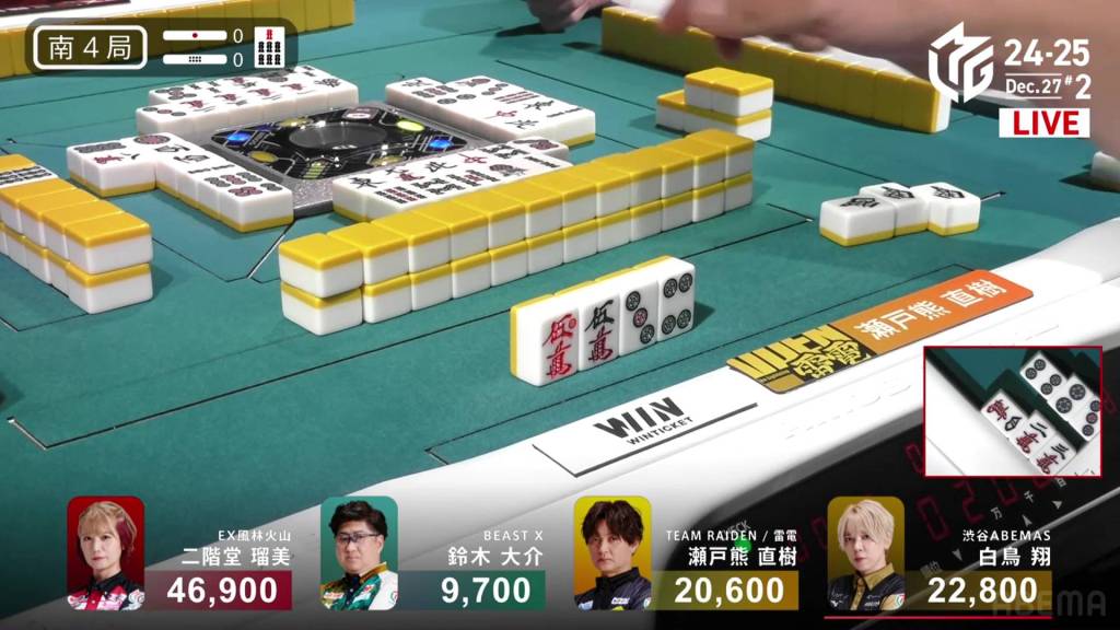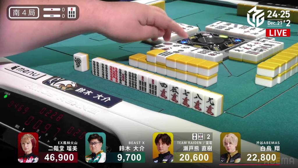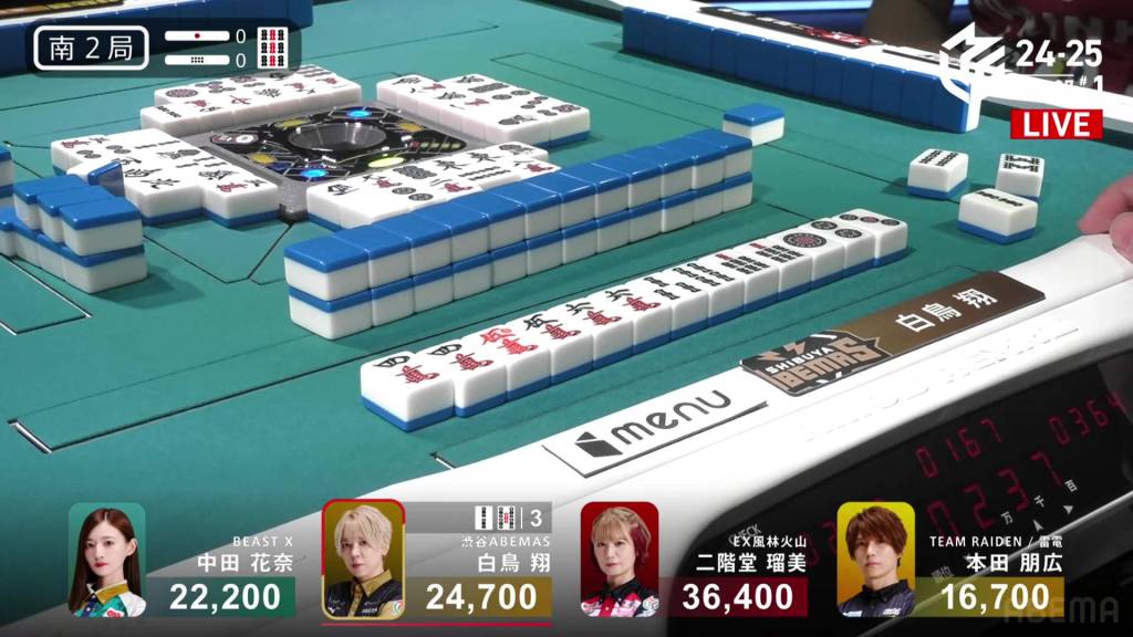 In S2-0, Shiratori is the dealer in 2nd place and 11,700 behind 1st place Rumi. Having gotten four 1sts in a row, Shiratori wants to win this game and tie the M-League record of 5 wins.