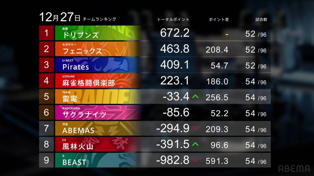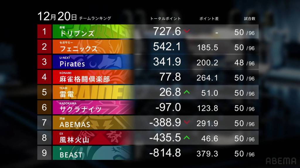 Akasaka Drivens, Team Raiden and Sega Sammy Phoenix all dropped this week. Playing in only two games this week, the Akasaka Drivens had a 2nd and a negative 4th to push them back below +700.0pts. Team Raiden couldn’t get 1st place and the team dropped below 0.0pts this week. For the Sega Sammy Phoenix, Genta got his first 4th place of the season in one of their two games this week, with Daigo only getting a 3rd to push them further away from the top.