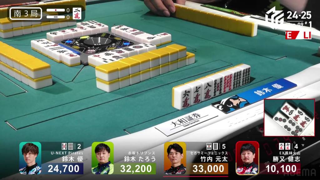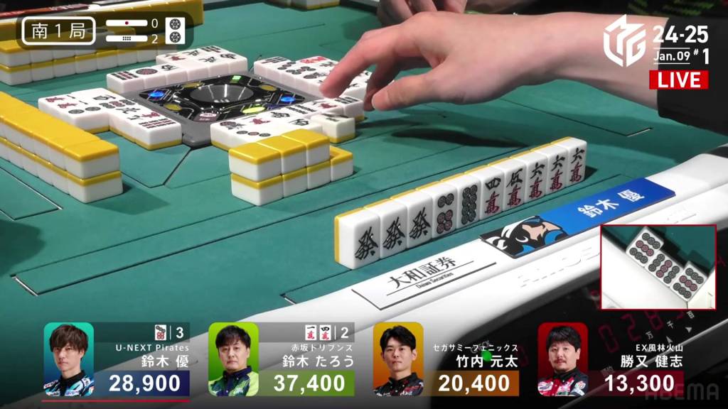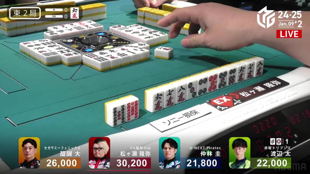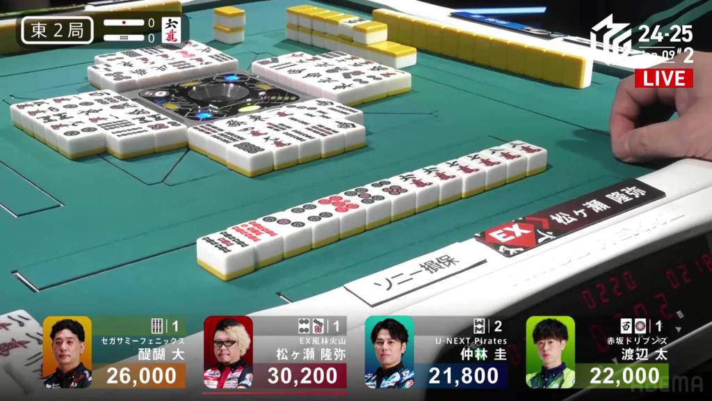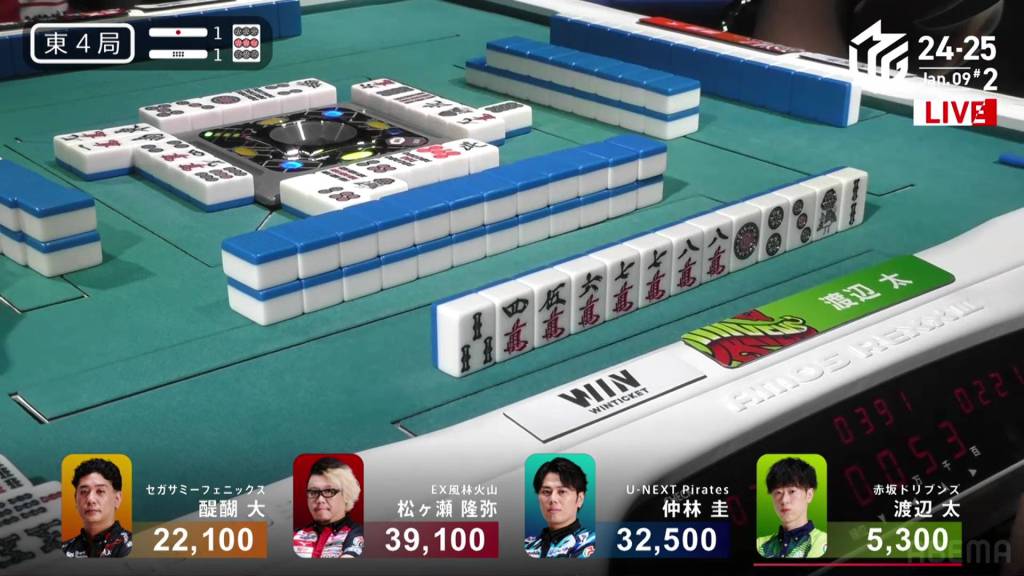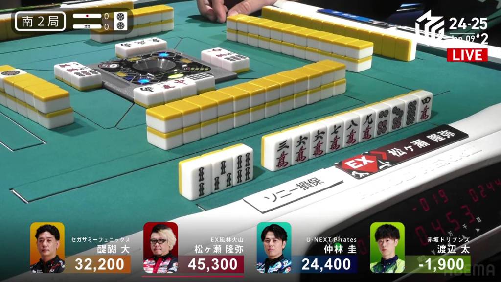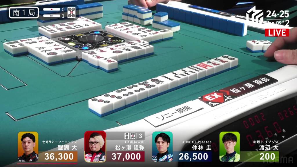 In E2-0, Matsugase is the dealer and sitting in 1st place. After Katsumata’s big negative the previous game, Matsugase wants to raise the team back up into 7th place.