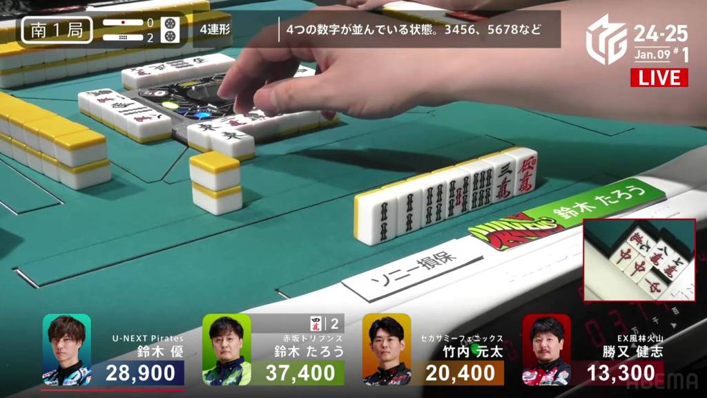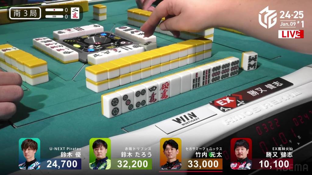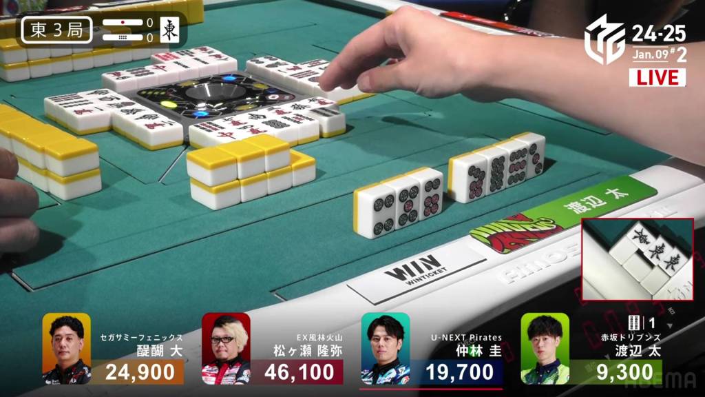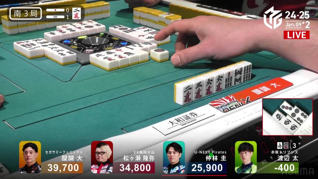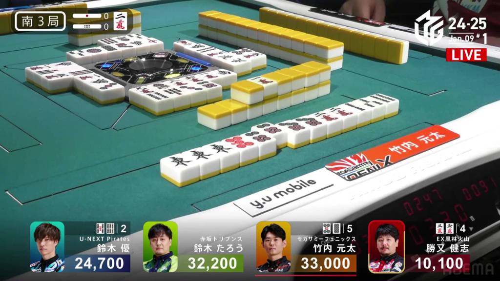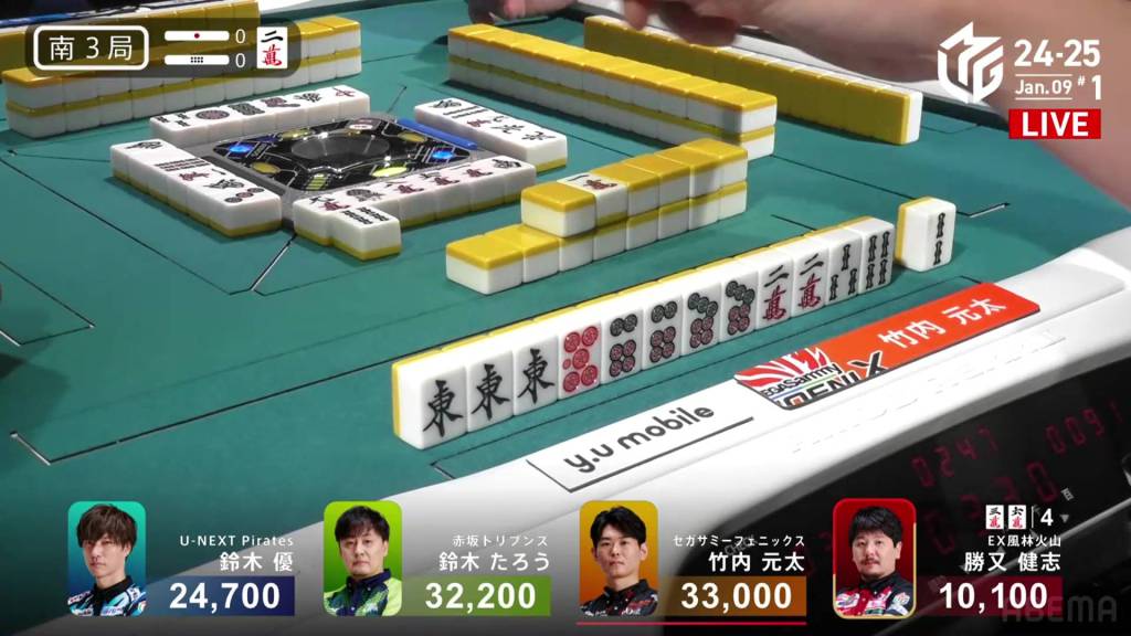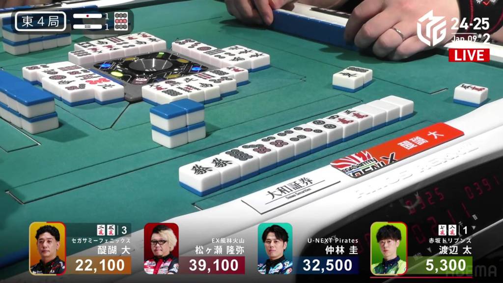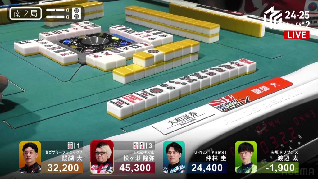 In E2-0, Matsugase is the dealer and sitting in 1st place. After Katsumata’s big negative the previous game, Matsugase wants to raise the team back up into 7th place.