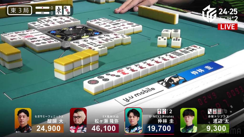 Posing much more danger, though, is Nakabayashi. In the middle of the second row, Nakabayashi pairs up the 6m dora and stays dama on an 8s kanchan, guaranteed a mangan if he wins.