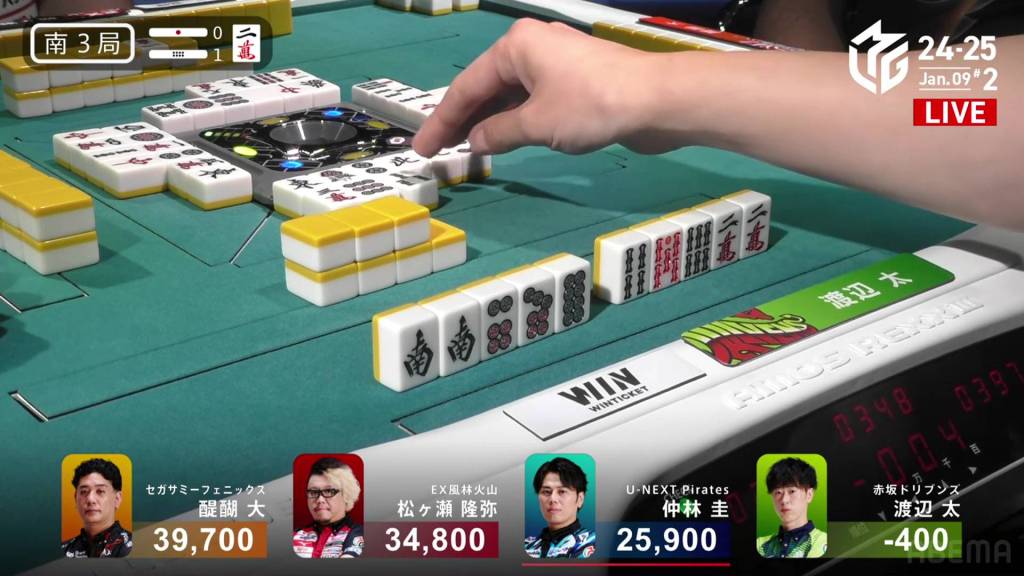 On Daigo’s next turn, he draws and discards the south and deals into Futoshi. Futoshi wins the hand with Double South/Dora 2/Aka 1 for 8,000+300.