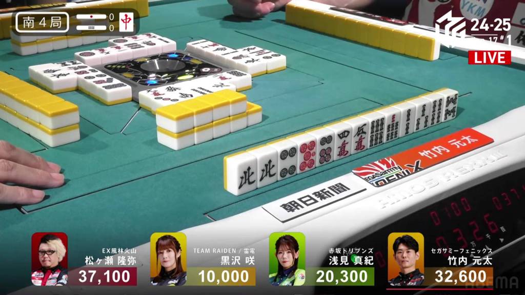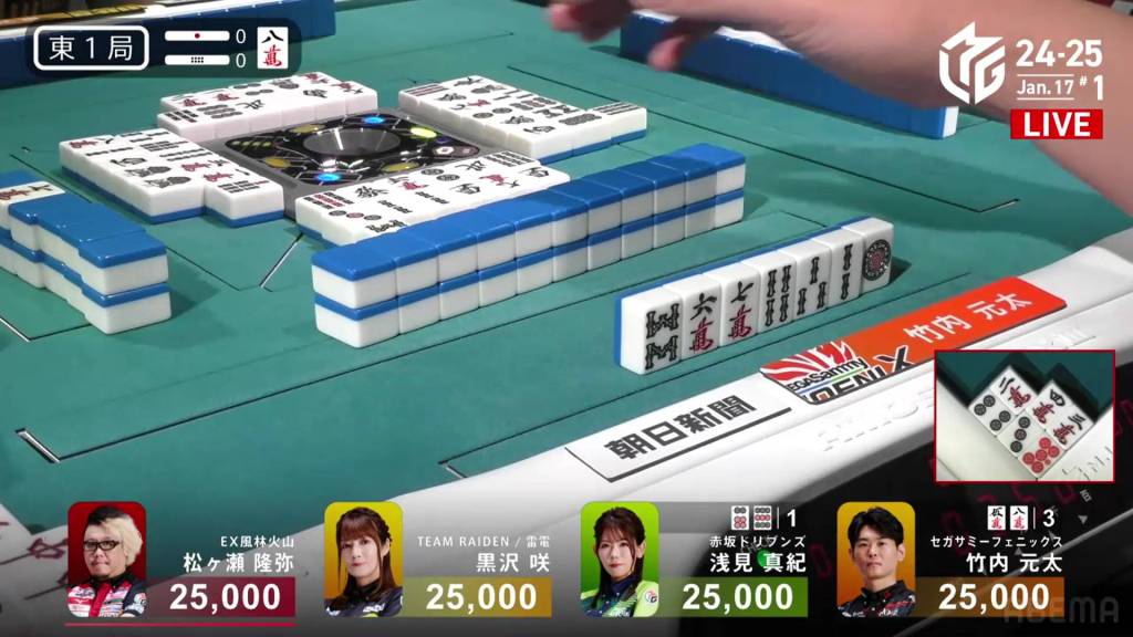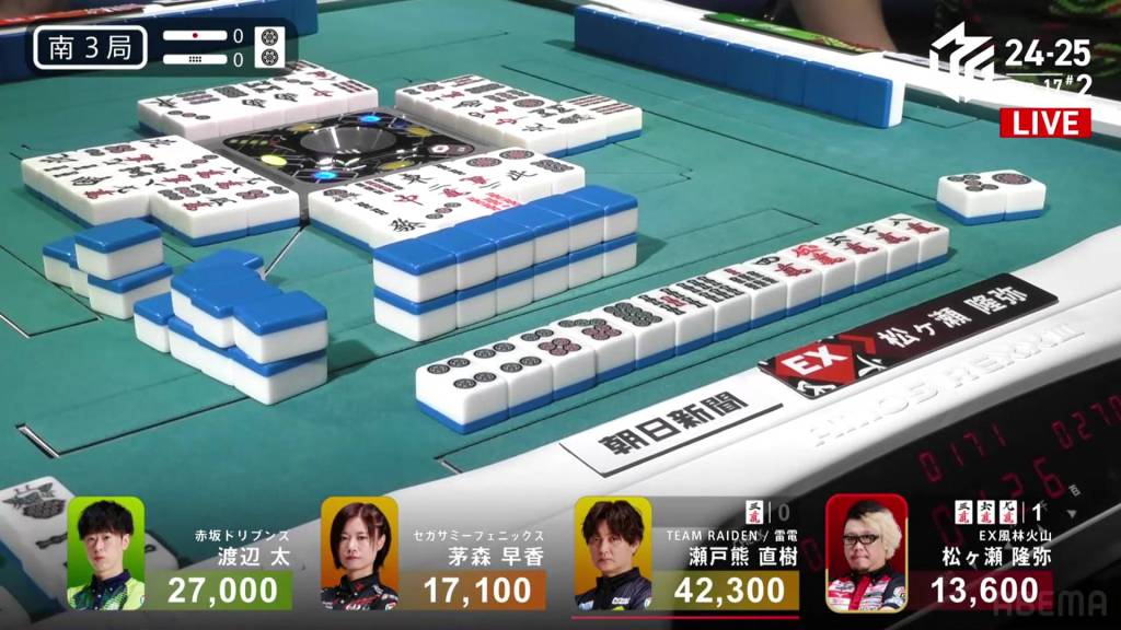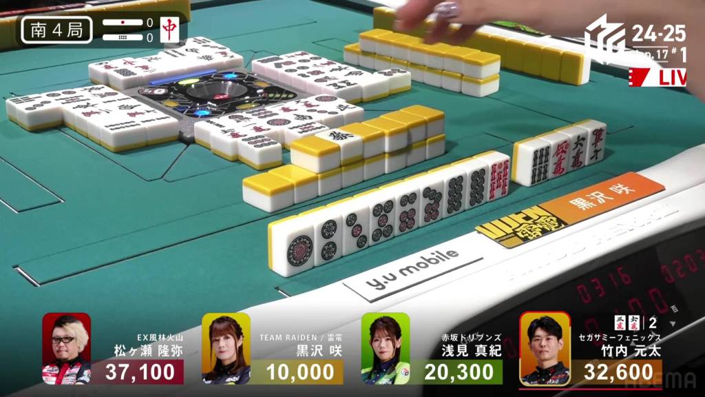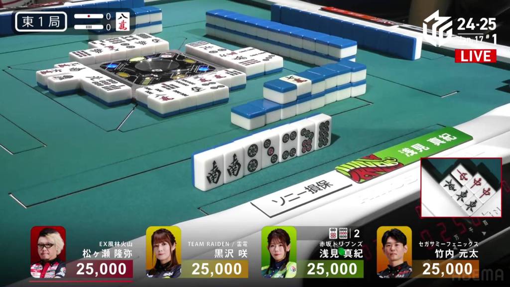 If Asami can draw the 9s herself, or get a direct hit off Matsugase and hit the uradora, she will have her sixth 1st in a row. All remaining 3 of the other 9s are left in the wall.
