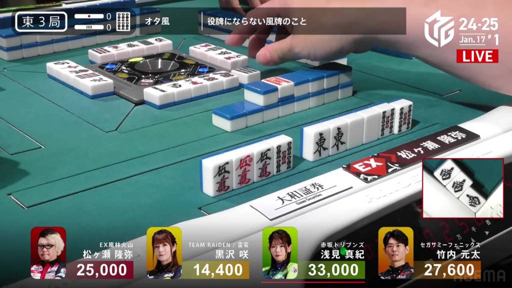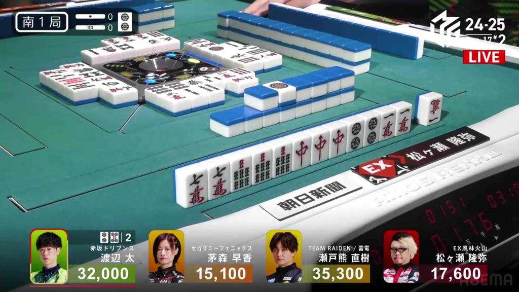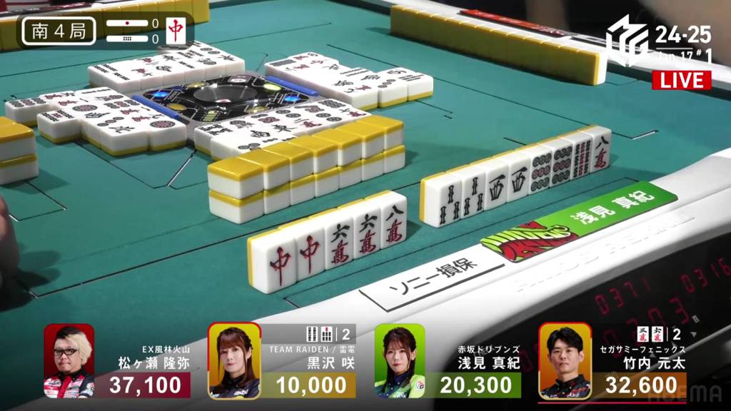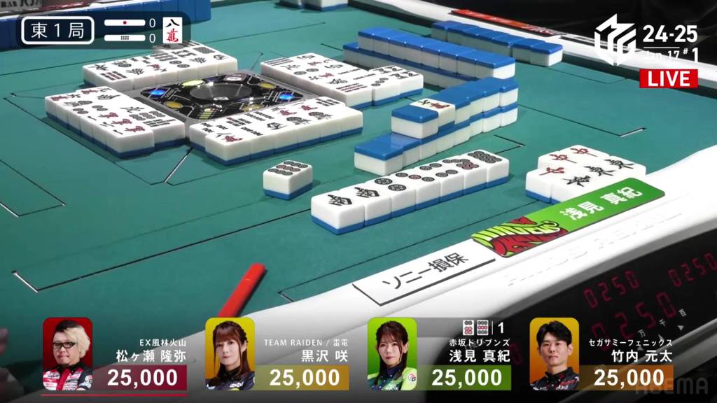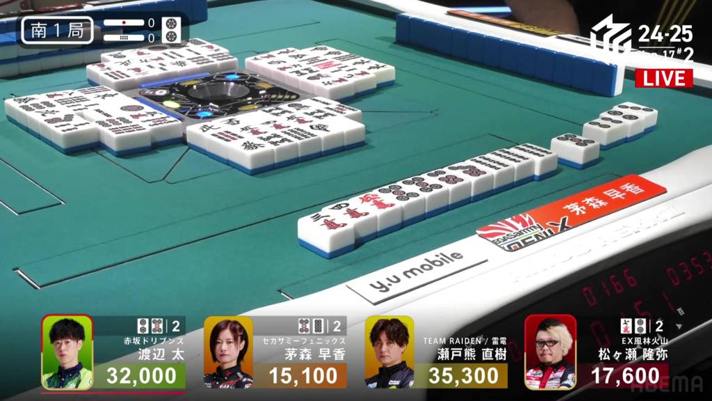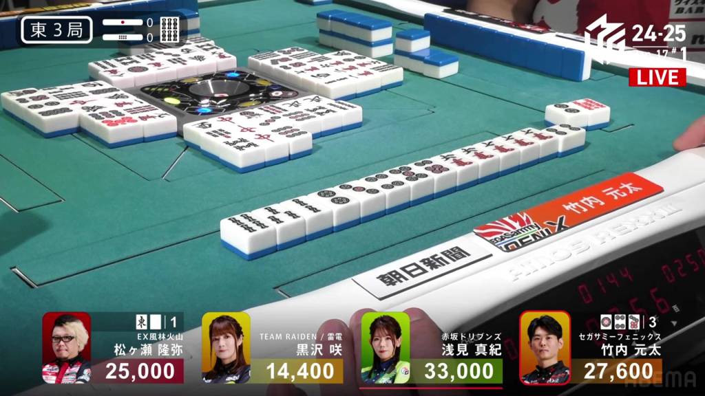If Asami can draw the 9s herself, or get a direct hit off Matsugase and hit the uradora, she will have her sixth 1st in a row. All remaining 3 of the other 9s are left in the wall.