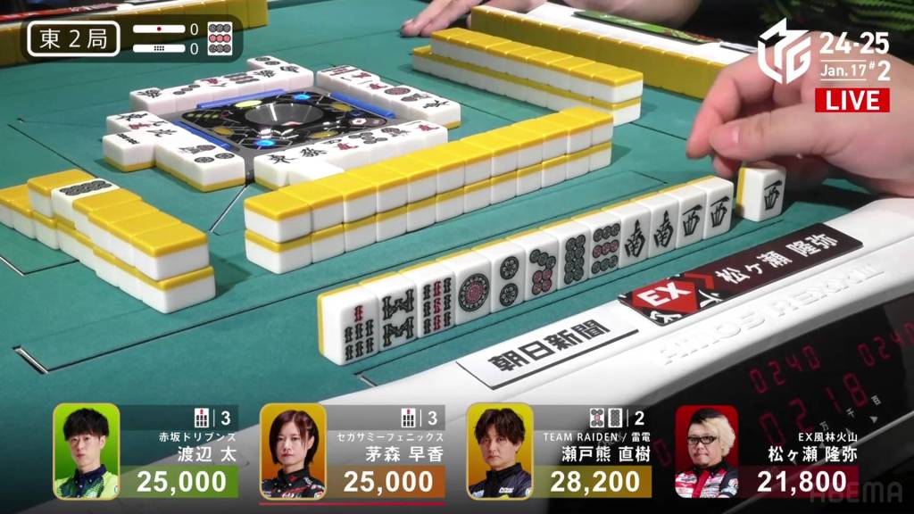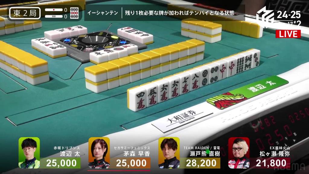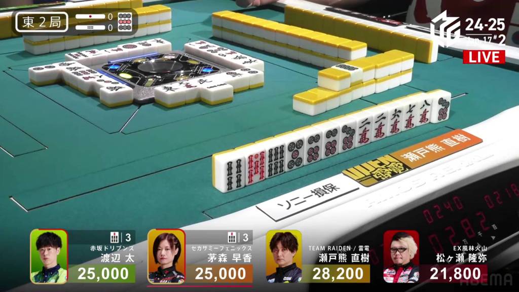 Matsugase starts out the hand at 4-shanten and with no easy way to speed it up. To his left, 1st place dealer Setokuma is 2-shanten with a pair of green dragons, a connected dora 2p and a secured red 5p. Within the first five turns, Setokuma calls pon on the green dragon and makes a 123s chii to get to tenpai on a 3m penchan.