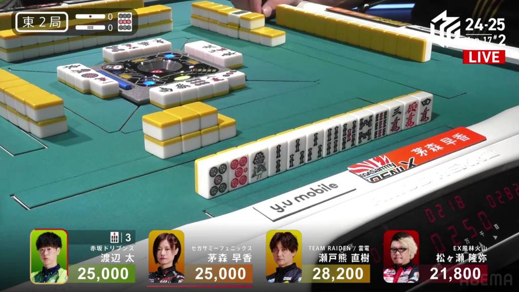 Two turns later, on the second-last tile in the wall, Kayamori draws the 5p and wins the hand. Kayamori wins with Tanyao/Aka 1 for 500/1,000 plus two riichi sticks, ending Matsugase’s yakuman hopes and pushing him into 4th in the process.