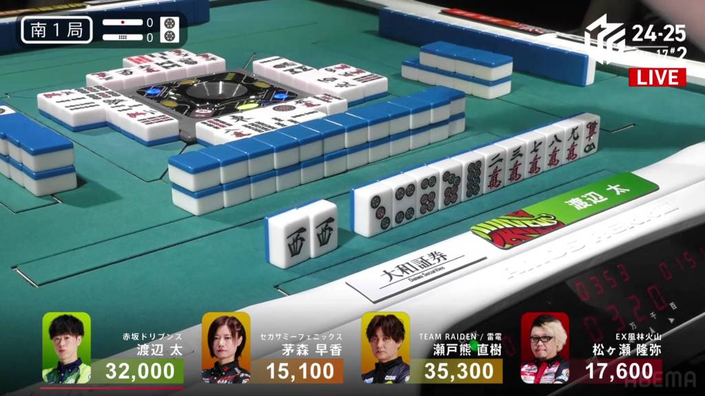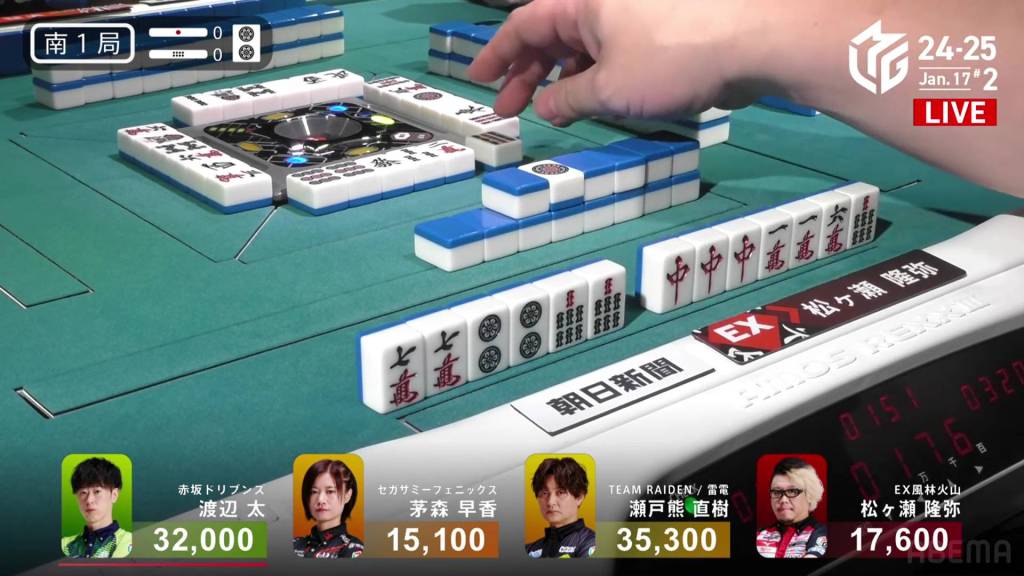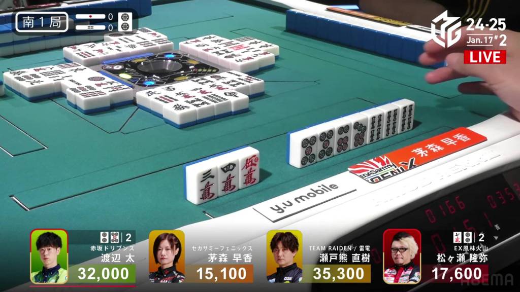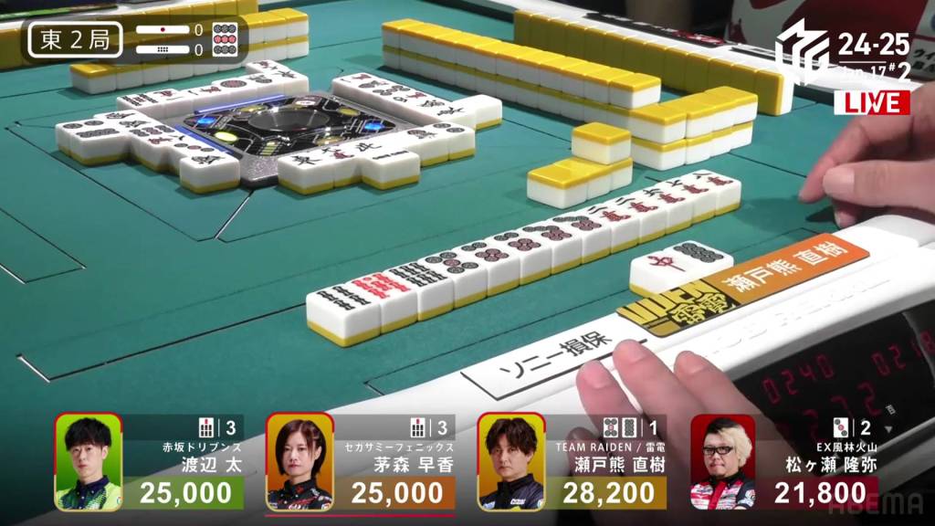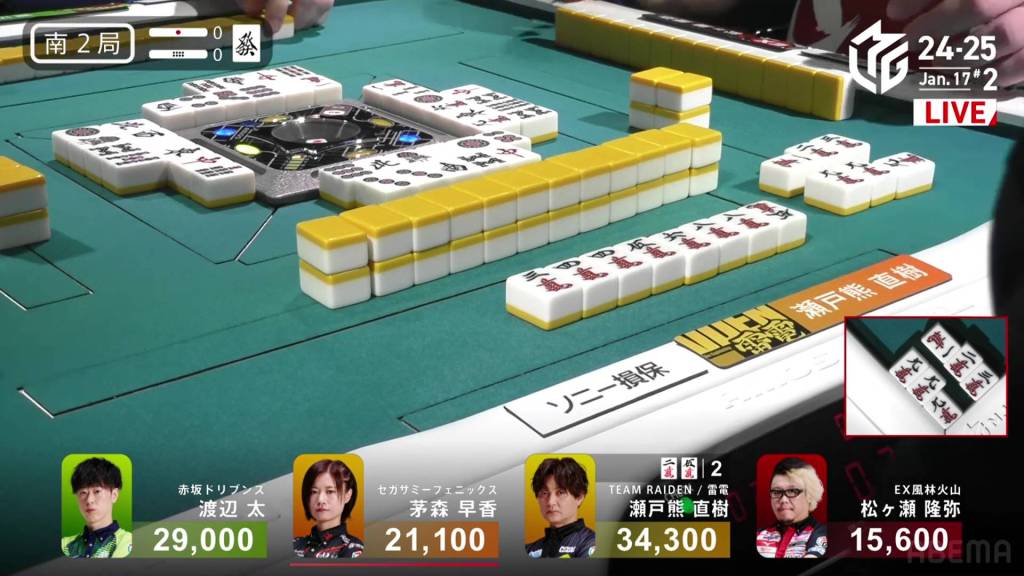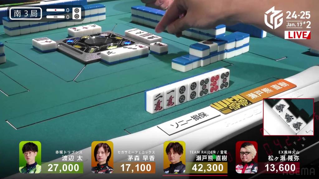 And in the 3rd row, Setokuma is the third to riichi, waiting on a 58p ryanmen for mangan minimum.