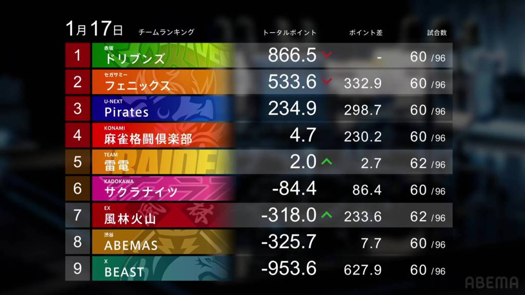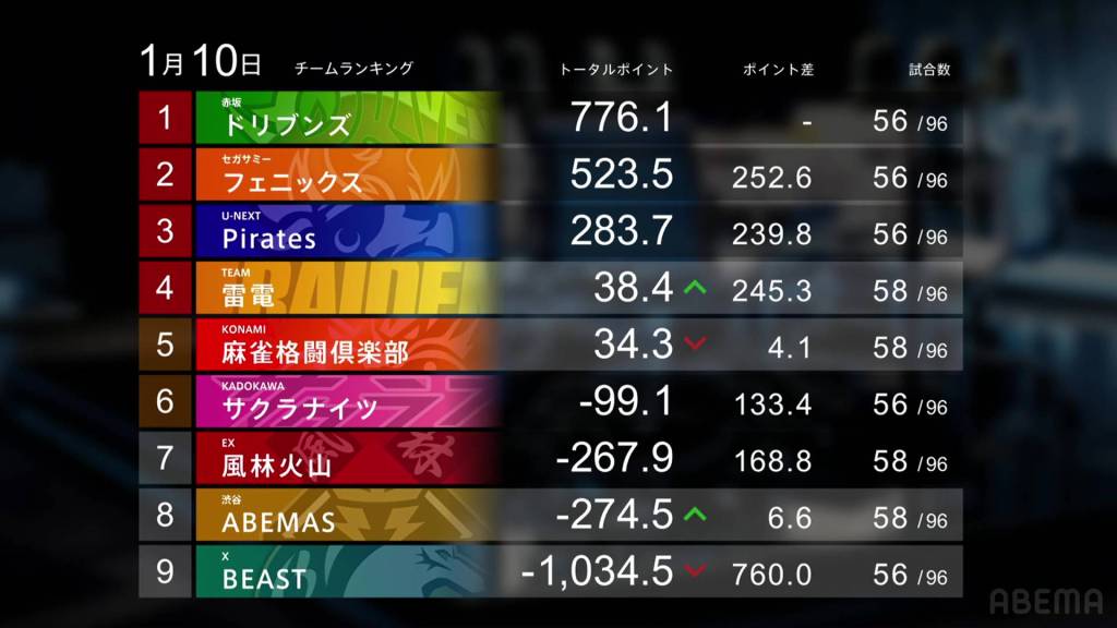 And that’s all for this week! Only 10 more weeks until the end of the regular season! Can the Akasaka Drivens break +1000.0pts? Can any team catch up to them? How many more yakuman will we see this season? As always, we’ll just have to wait and see!