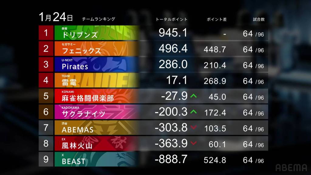 The Beast X, U-Next Pirates, Shibuya Abemas and Team Raiden all gained points this week. The Beast X had Sugawara getting a strong 1st place in her game and Daisuke getting 2nds to move the team into the -800.0pts range. The U-Next Pirates finally got their first 1st place in almost a month and finished that day with a second 1st place. The Shibuya Abemas had a bunch of 3rds this week, but Hinata’s big 60,300 1st place edged the team positive and into 7th place. And for Team Raiden, two 2nds in their two games this week kept them above 0.0pts.