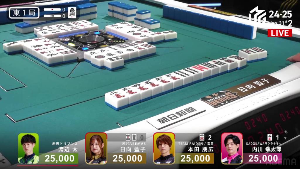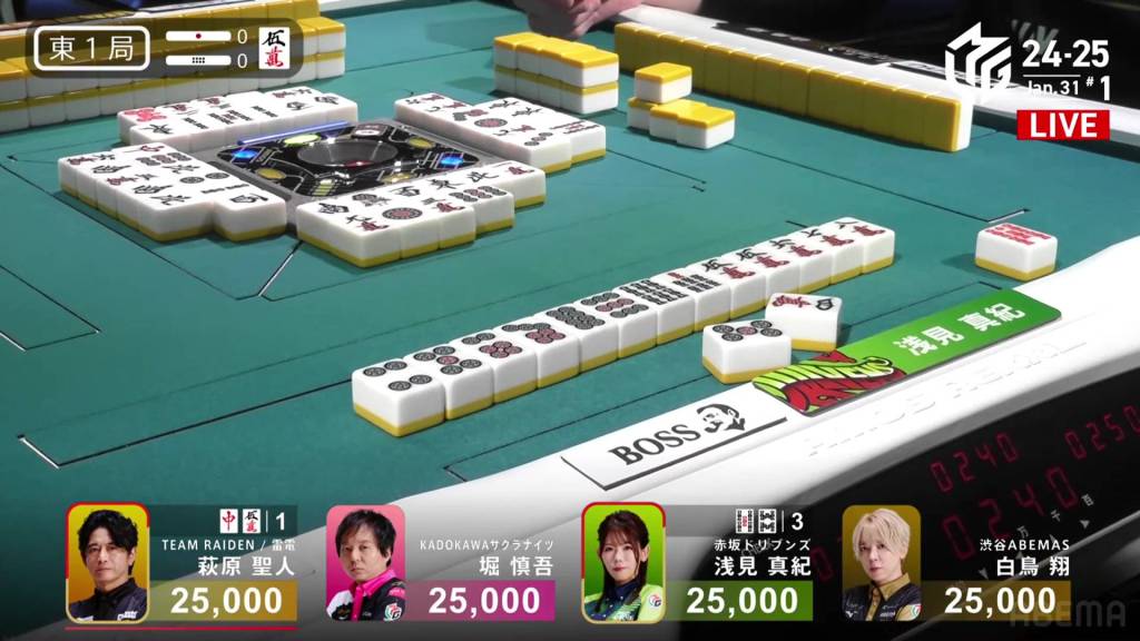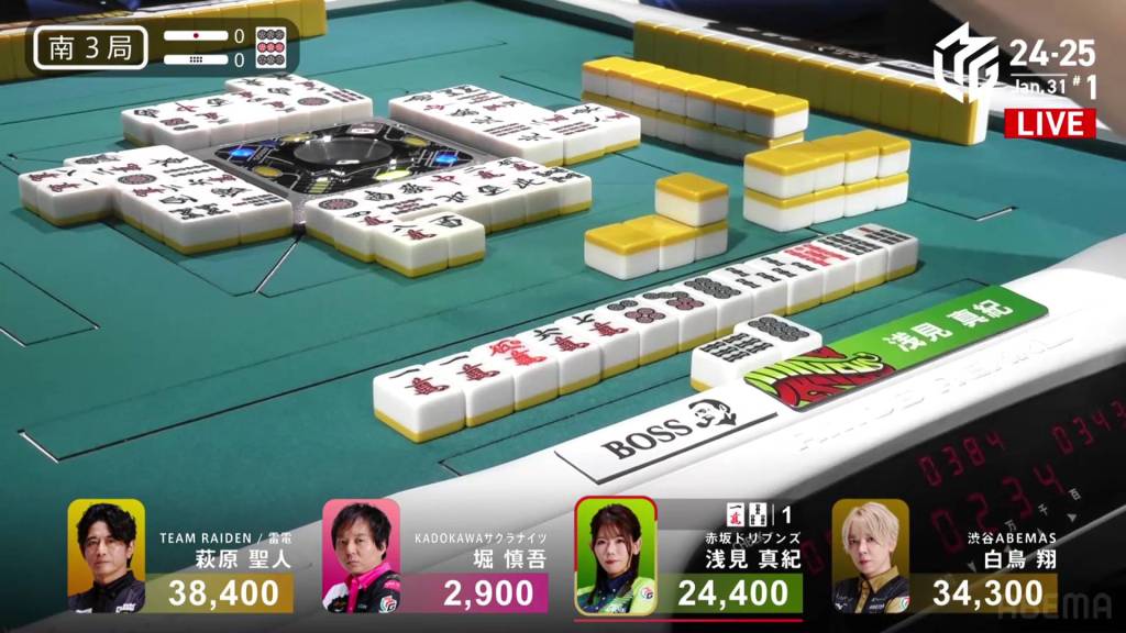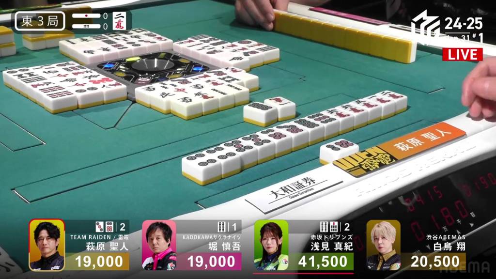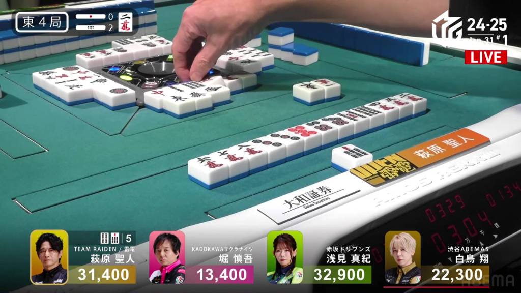 In E4-2, Hagiwara is now just 1,500 behind 1st place Asami. With two honba any win will put him into 1st place.