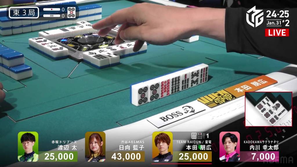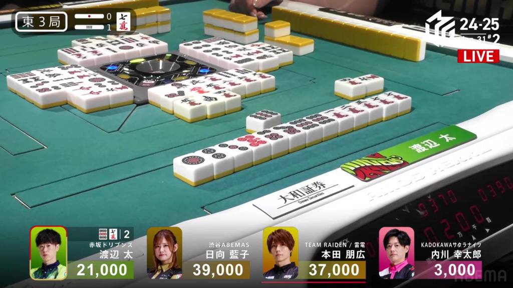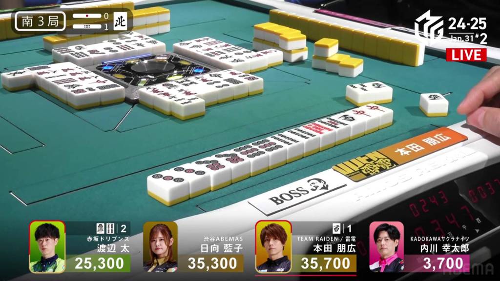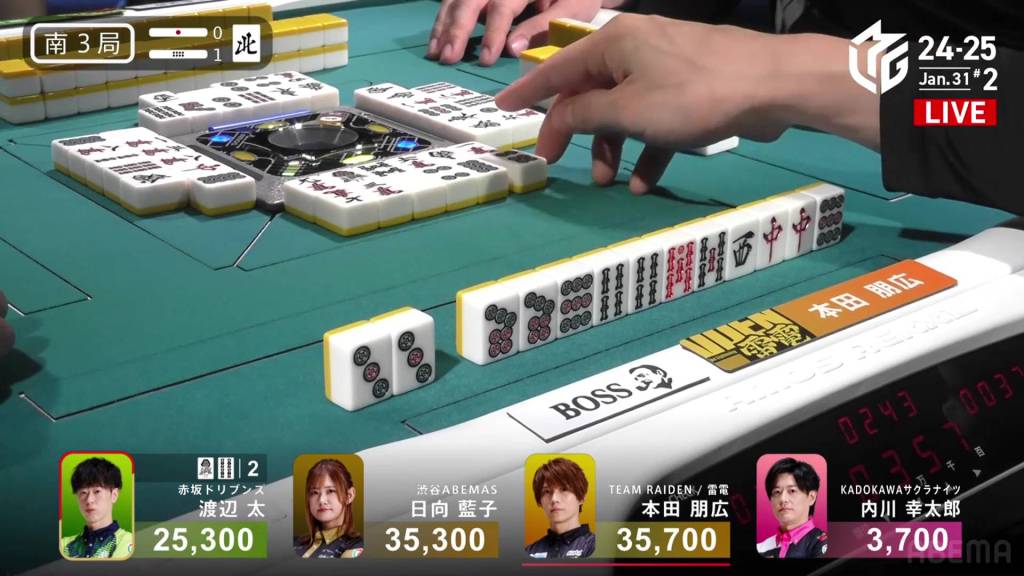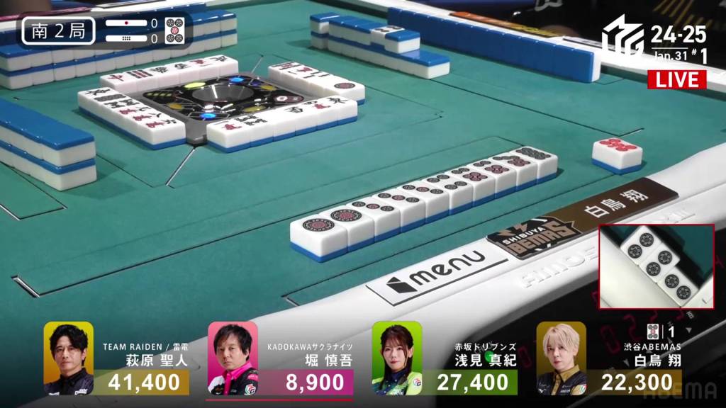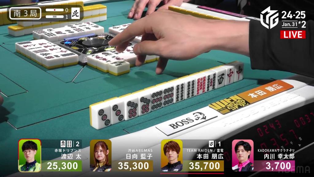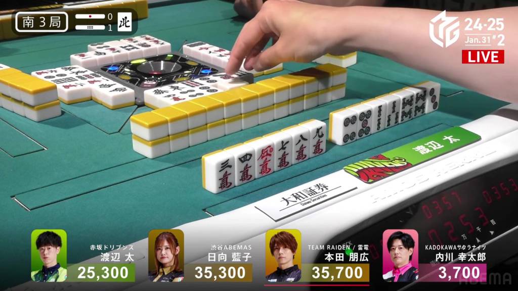 After a few turns of pushing, Shiratori ends up folding his hand after drawing the dangerous 4m. Immediately after, Hagiwara draws and discards the red dragon, a missed win for the Abemas player.