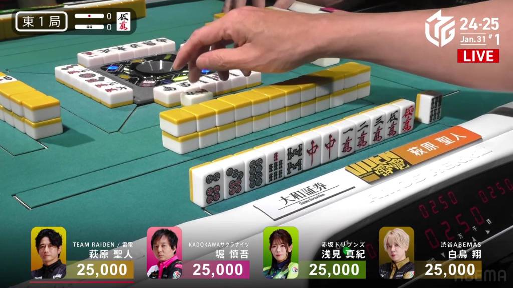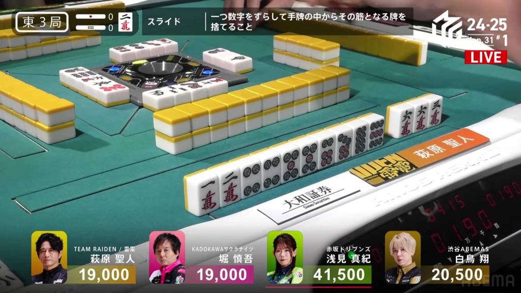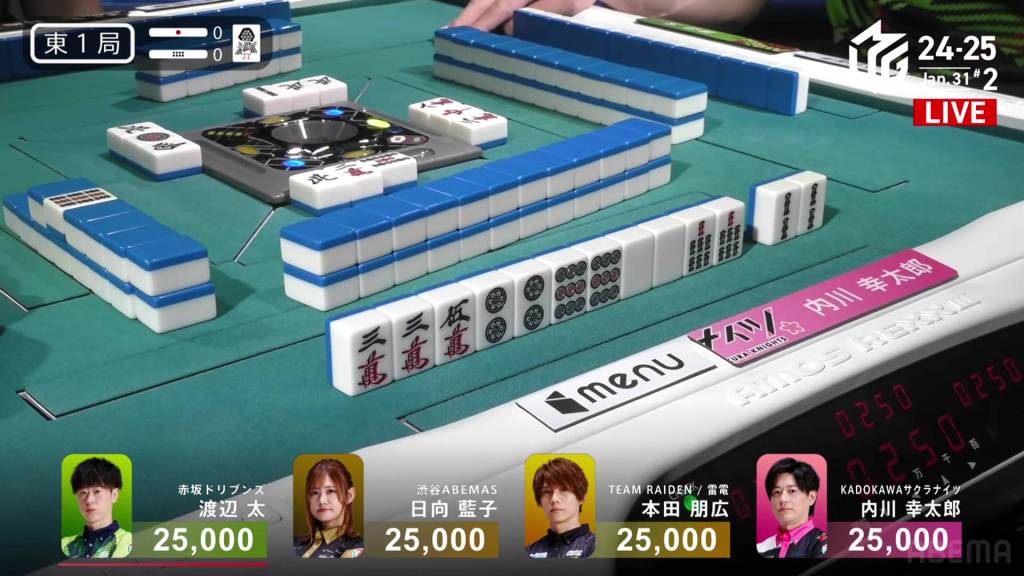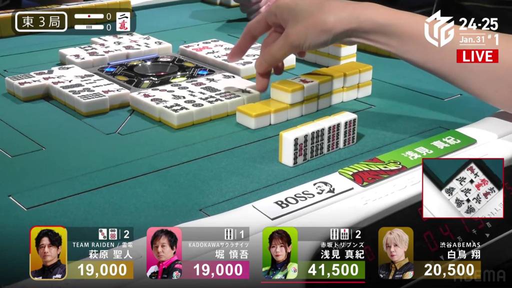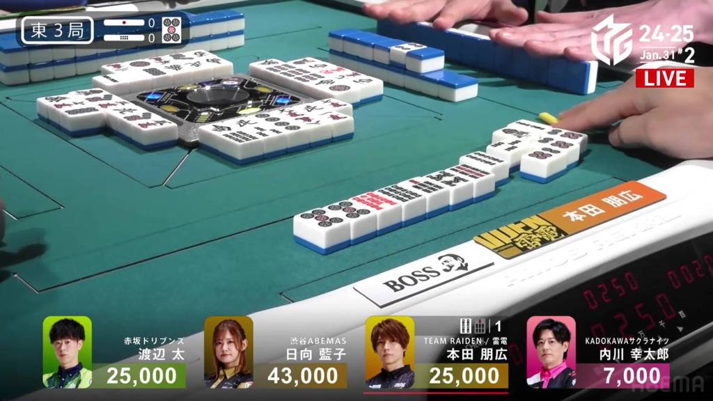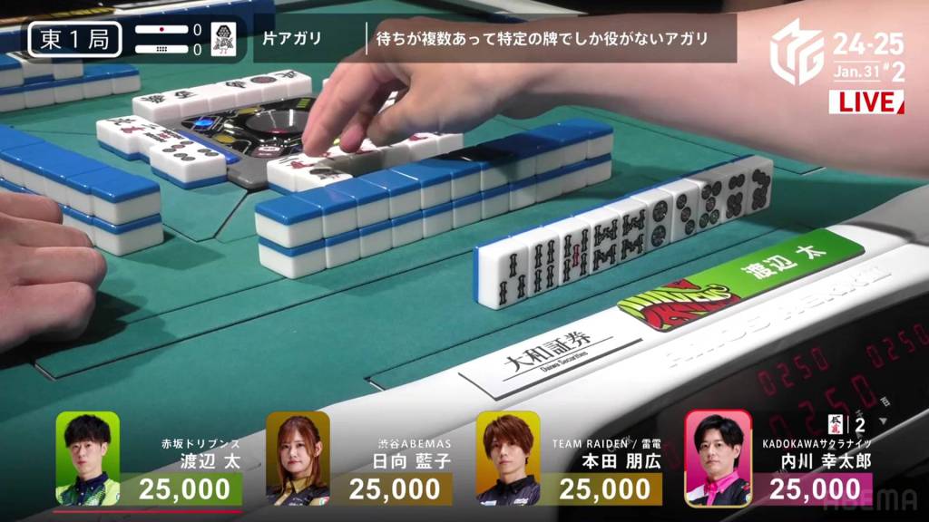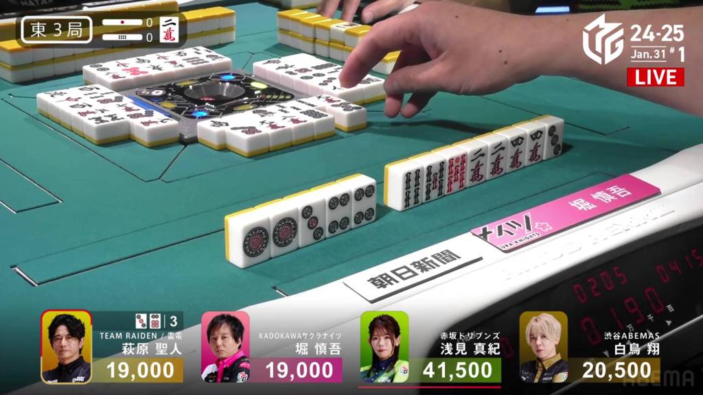 After a few turns of pushing, Shiratori ends up folding his hand after drawing the dangerous 4m. Immediately after, Hagiwara draws and discards the red dragon, a missed win for the Abemas player.