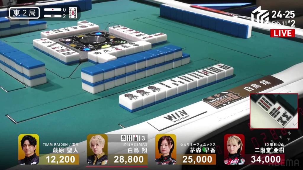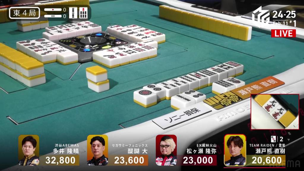 In E2-2, Shiratori is in 2nd place having won the previous hand and sits 5,200 behind 1st place Aki.
