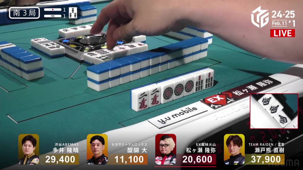 Even though he has a dealer riichi, Ooi won’t go unchallenged. During the ippatsu round, Matsugase gets to tenpai and chases on a 6m kanchan.