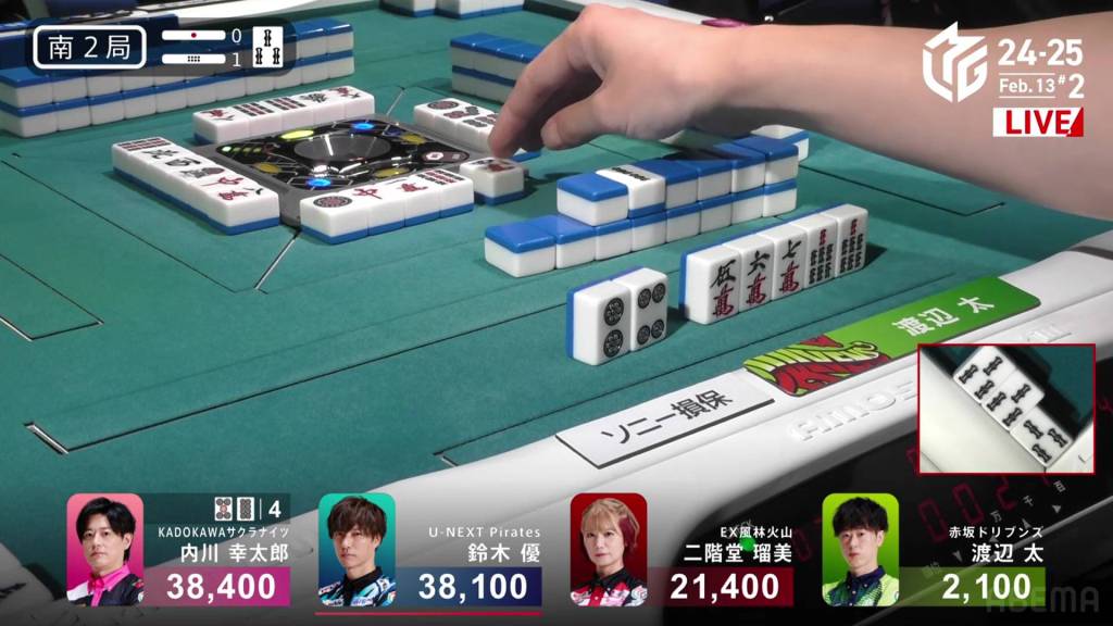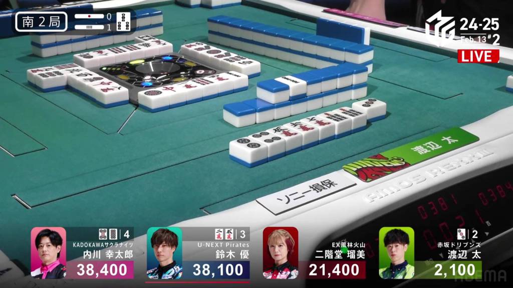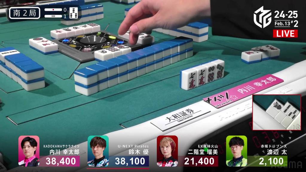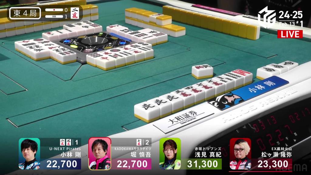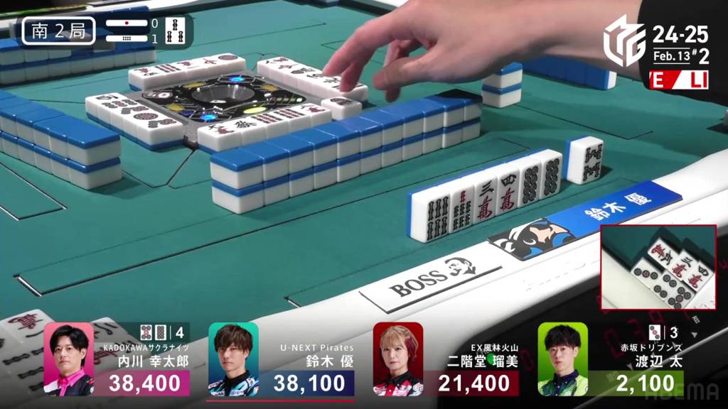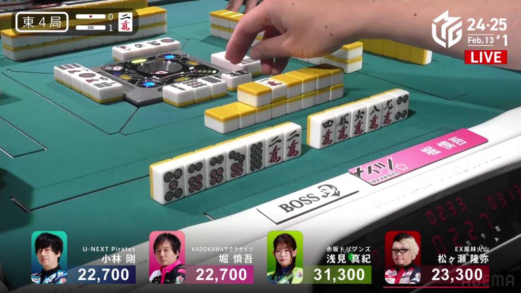 In S2-1, Futoshi is in 4th place and 19,300 from 3rd place Rumi. Though far away, Futoshi still has two hands plus his dealership left to go through.