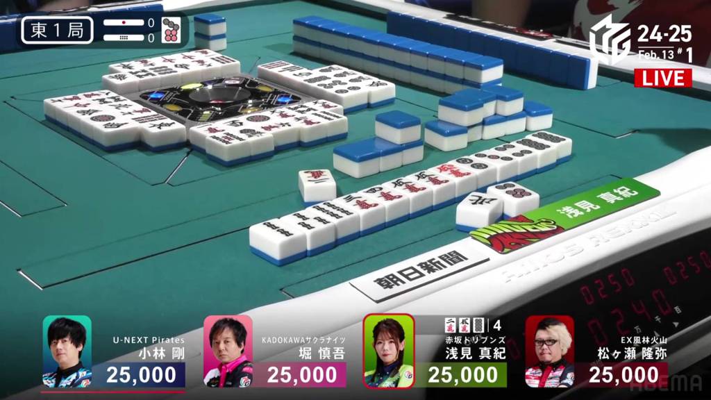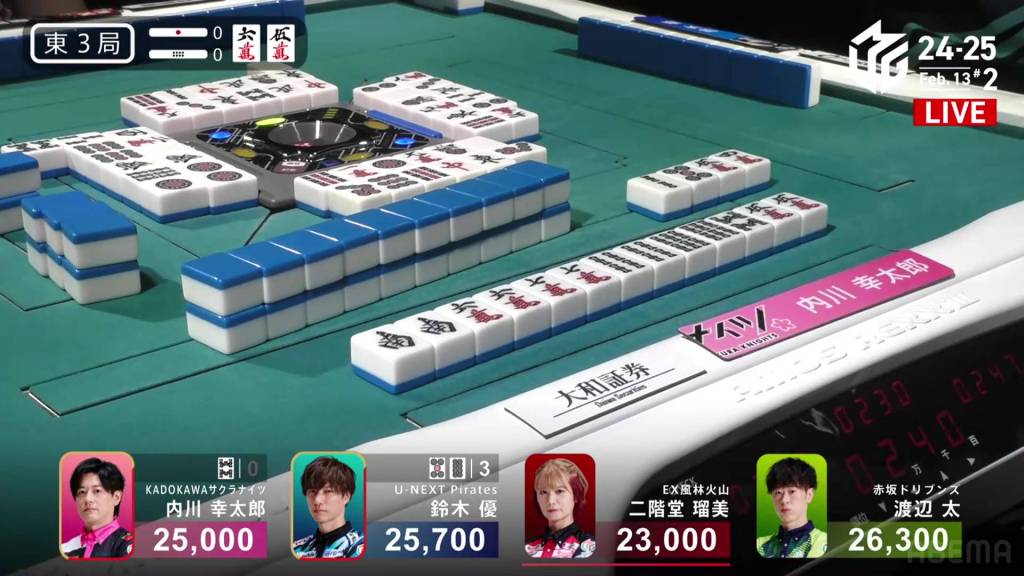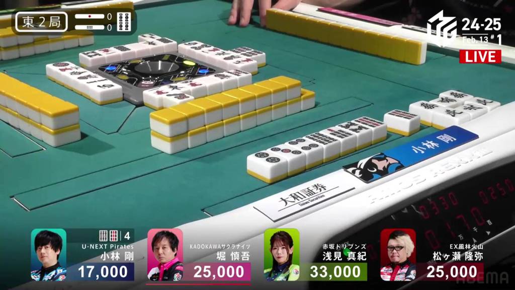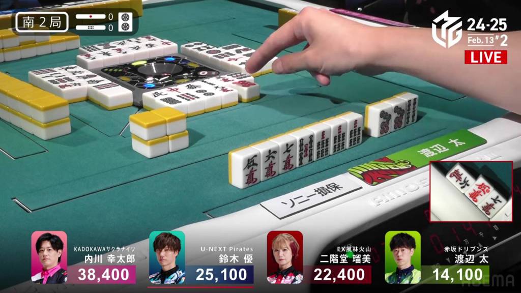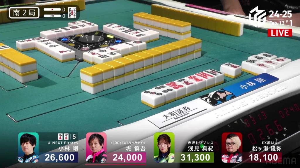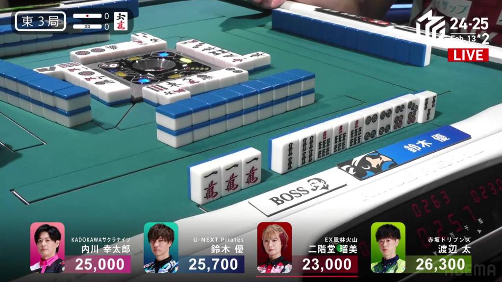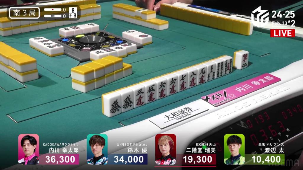 In S2-1, Futoshi is in 4th place and 19,300 from 3rd place Rumi. Though far away, Futoshi still has two hands plus his dealership left to go through.